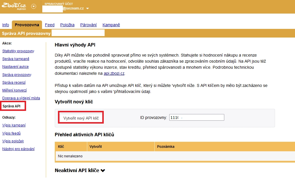 Für Zboží.cz gehen Sie bitte zum Tab 'Betrieb' und setzen Sie im rechten Seitenbereich fort, indem Sie auf 'API-Verwaltung' klicken.