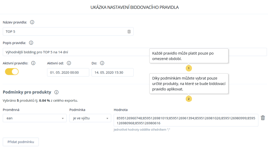 Sobald Sie die Regel gespeichert haben, müssen Sie auf das erste Abrufen von Statistiken von Heureka und Zboží warten. Die maximale Zeit für das erste Abrufen der Statistiken beträgt 24 Stunden. Anschließend werden die Statistiken alle 2 Stunden abgerufen und die Bidding-Regel wird entsprechend dem festgelegten Intervall ausgewertet und neu berechnet.