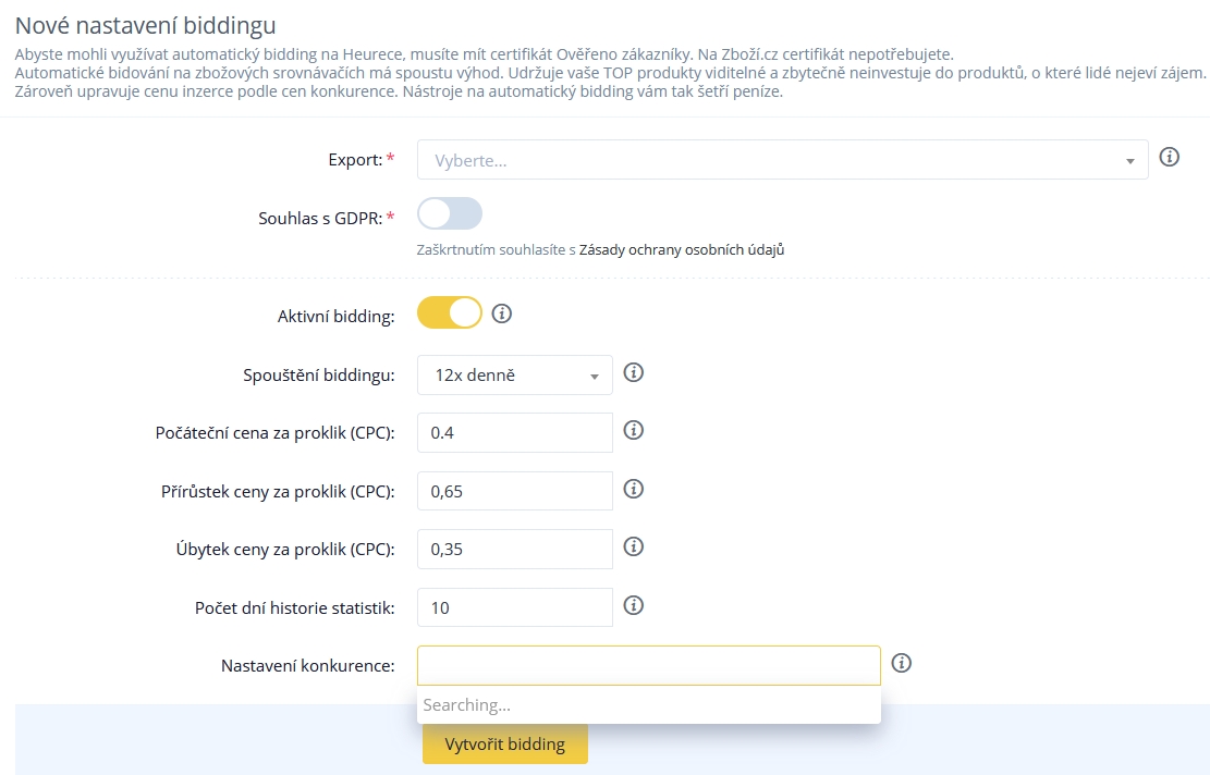 Zum Einrichten des automatischen Biddings für Heureka (CZ, SK) oder Zboží ist es zunächst erforderlich importovat XML feed, Weiterhin vytvořit export die URL der XML-Feeds vložit do administrace Heureky oder Zboží.