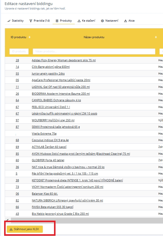 Die Übersicht kann auch als XLS heruntergeladen werden, und Sie können beispielsweise Produkte filtern, die geboten werden sollen, aber keine Top-Position erreichen. So können Sie herausfinden, welchen Parameter sie nicht erfüllen, ob es sich um einen Preisunterschied, einen niedrigen Klickpreis oder einen höheren Kostenaufwand handelt, usw.