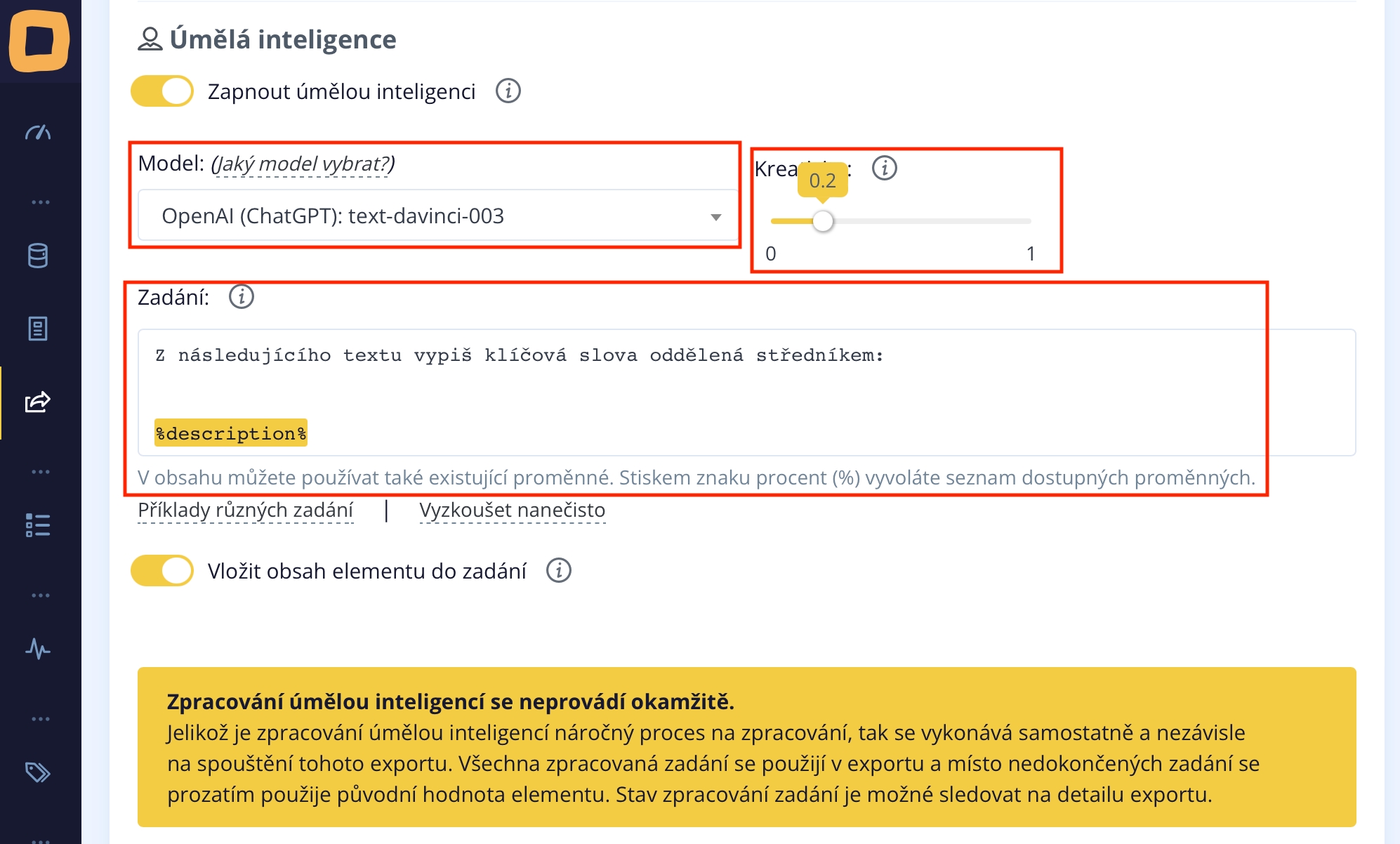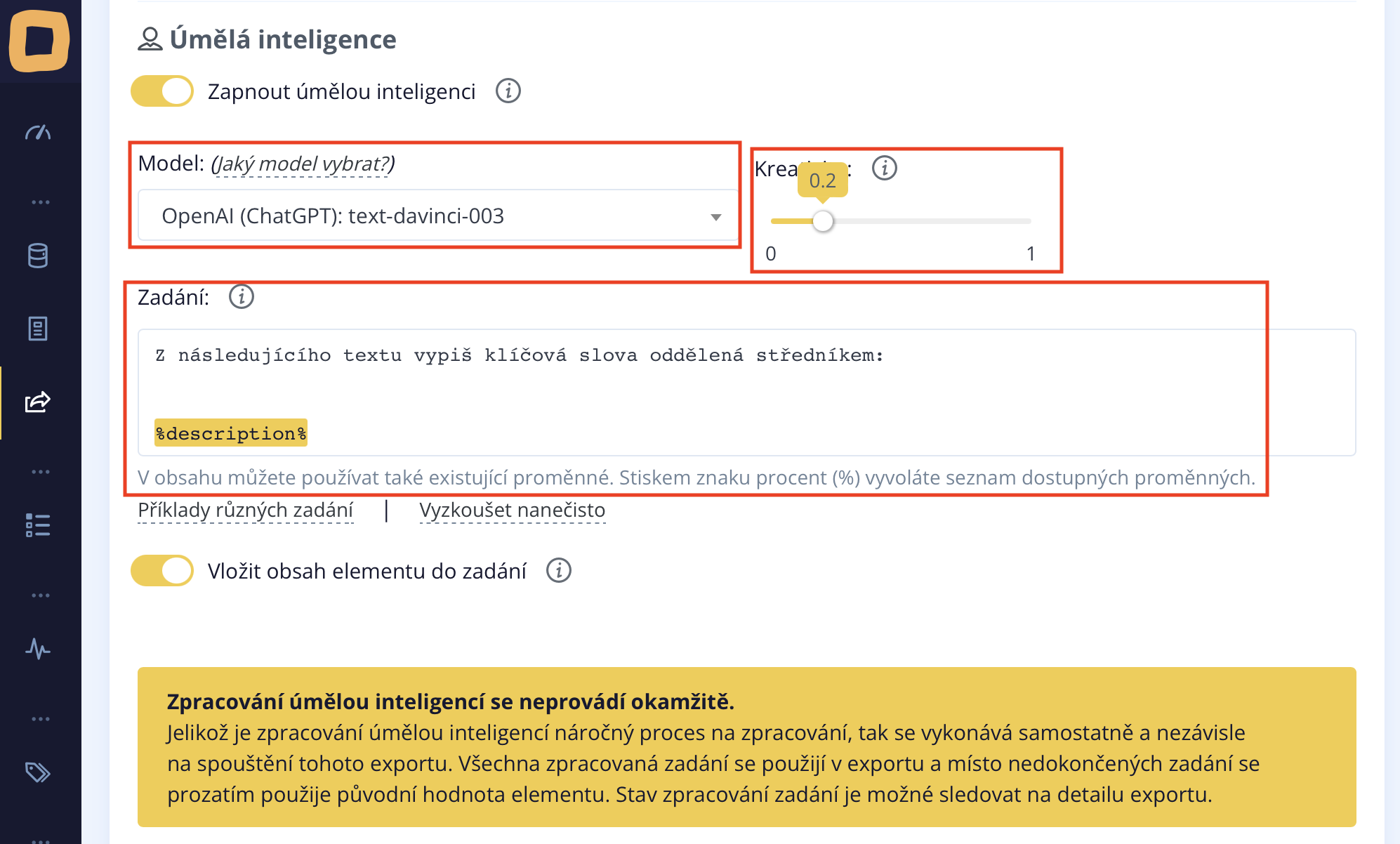Dann stellen wir die Kreativität ein. Wir haben den Wert 0.2 ausgewählt. Die Standardkreativität der KI liegt bei 0.7, aber in diesem Beispiel möchten wir nicht, dass die KI besonders kreativ ist. Wir möchten jedoch darauf hinweisen, dass je höher der Kreativitätswert ist, den Sie einstellen, desto mehr Freiraum geben Sie der künstlichen Intelligenz.