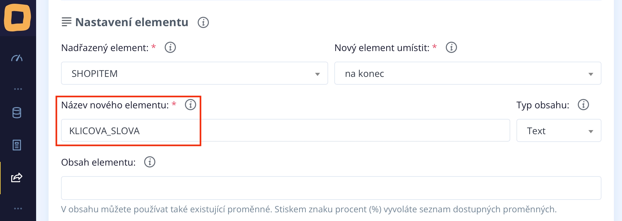 Jetzt benennen wir das neue Element, das die mit künstlicher Intelligenz gefundenen Schlüsselwörter enthält. Geben Sie im Feld "Name des neuen Elements" "SCHLUESSELWOERTER" ein. Natürlich können Sie das neue Element nach Belieben umbenennen.
