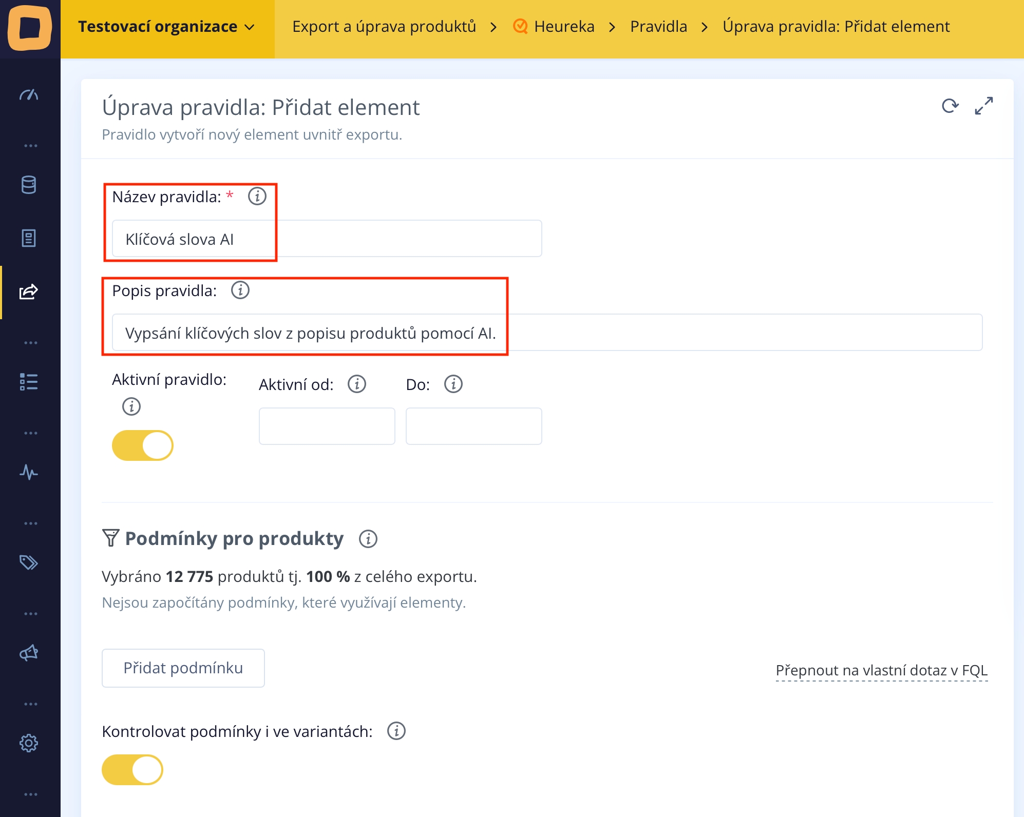 Wir geben der Regel einen Namen, zum Beispiel "Schlüsselwörter AI", und im Beschreibungsfeld geben wir an: "Extrahieren von Schlüsselwörtern aus Produktbeschreibungen mithilfe von KI". Auf diese Weise können wir diese Regel dann im Überblick aller Regeln identifizieren.