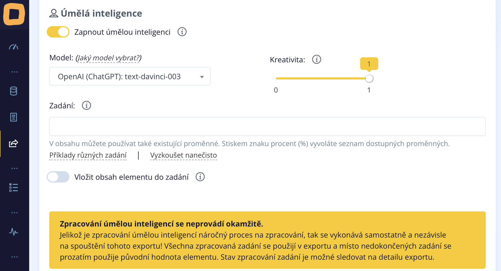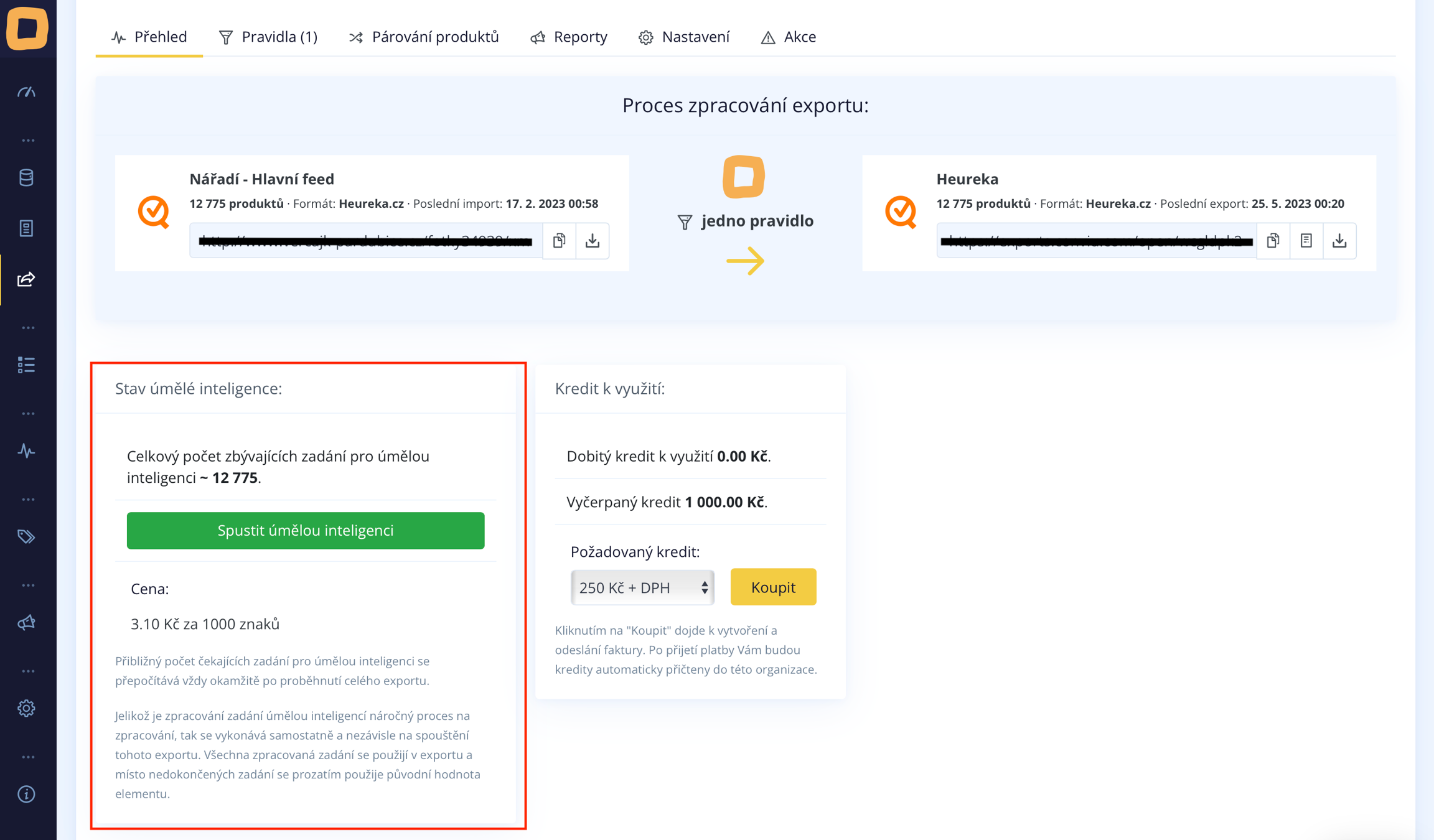 Es ist nicht möglich im Voraus zu sagen, wie viele Zeichen die KI generieren wird, daher finden Sie in der Tabelle nicht den Betrag, der für die Anwendung Ihrer erstellten Regel benötigt wird. Wir empfehlen daher, beispielsweise ein Guthaben in Höhe von 500,- Kč hochzuladen, von dem dann für Regeln, die KI nutzen, abgebucht wird.
