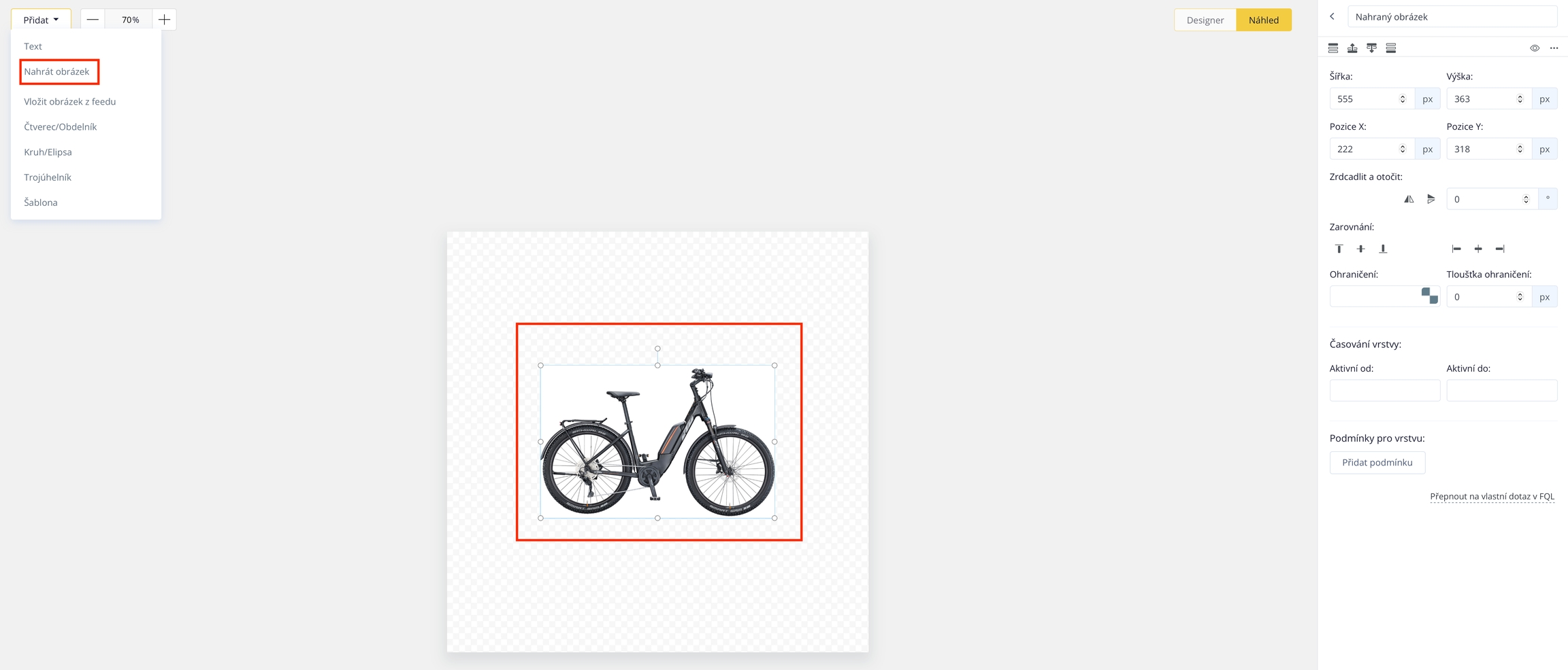 Mit dem eingefügten Bild können Sie ähnlich arbeiten wie mit einem Bild, das aus Ihrem Quellenfeed hochgeladen wurde. Sie können jedoch den Hintergrund nicht entfernen, vergrößern oder an die Leinwand anpassen. Sie können es jedoch umranden und die Farbe sowie die Dicke der Umrandung auswählen.