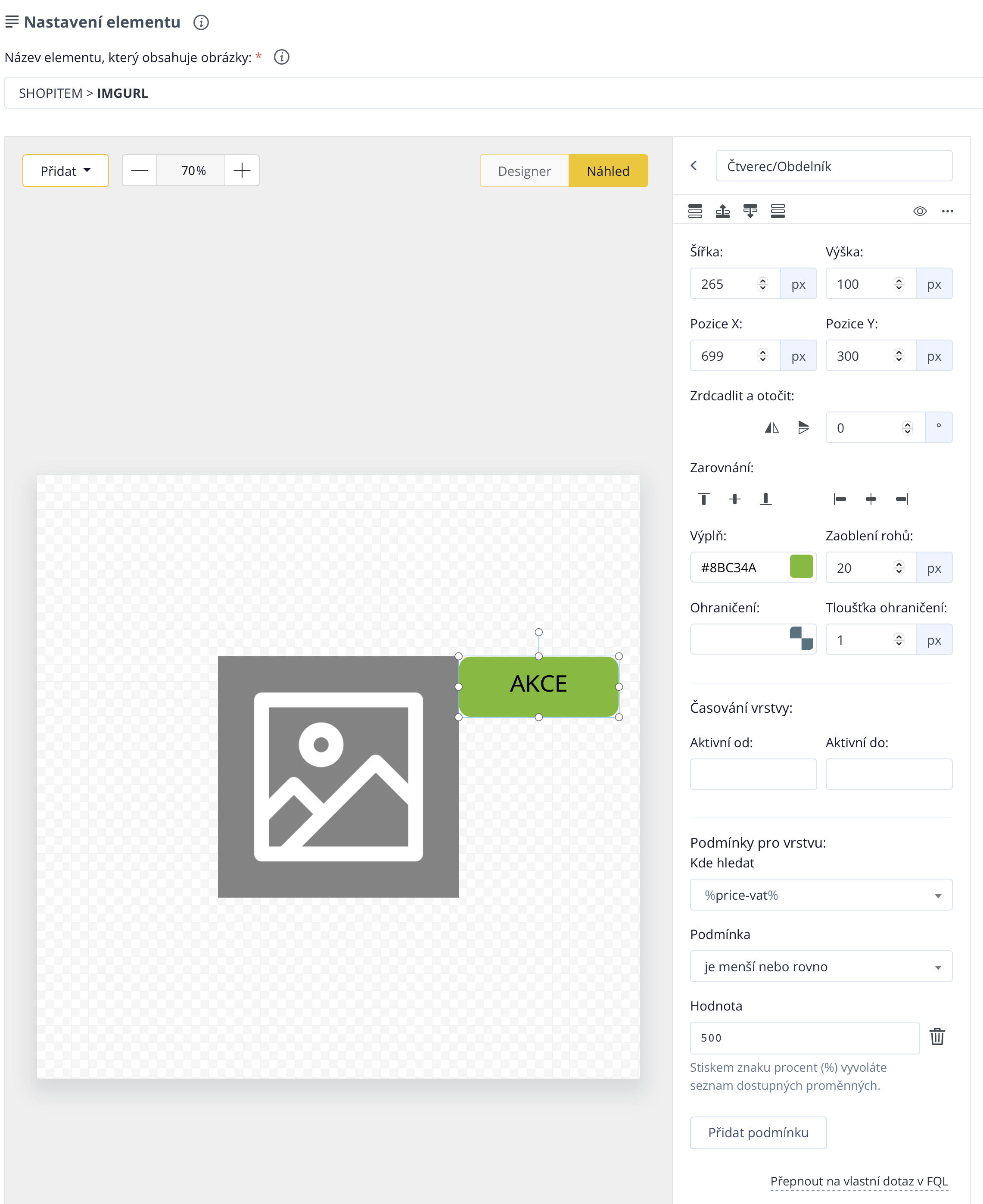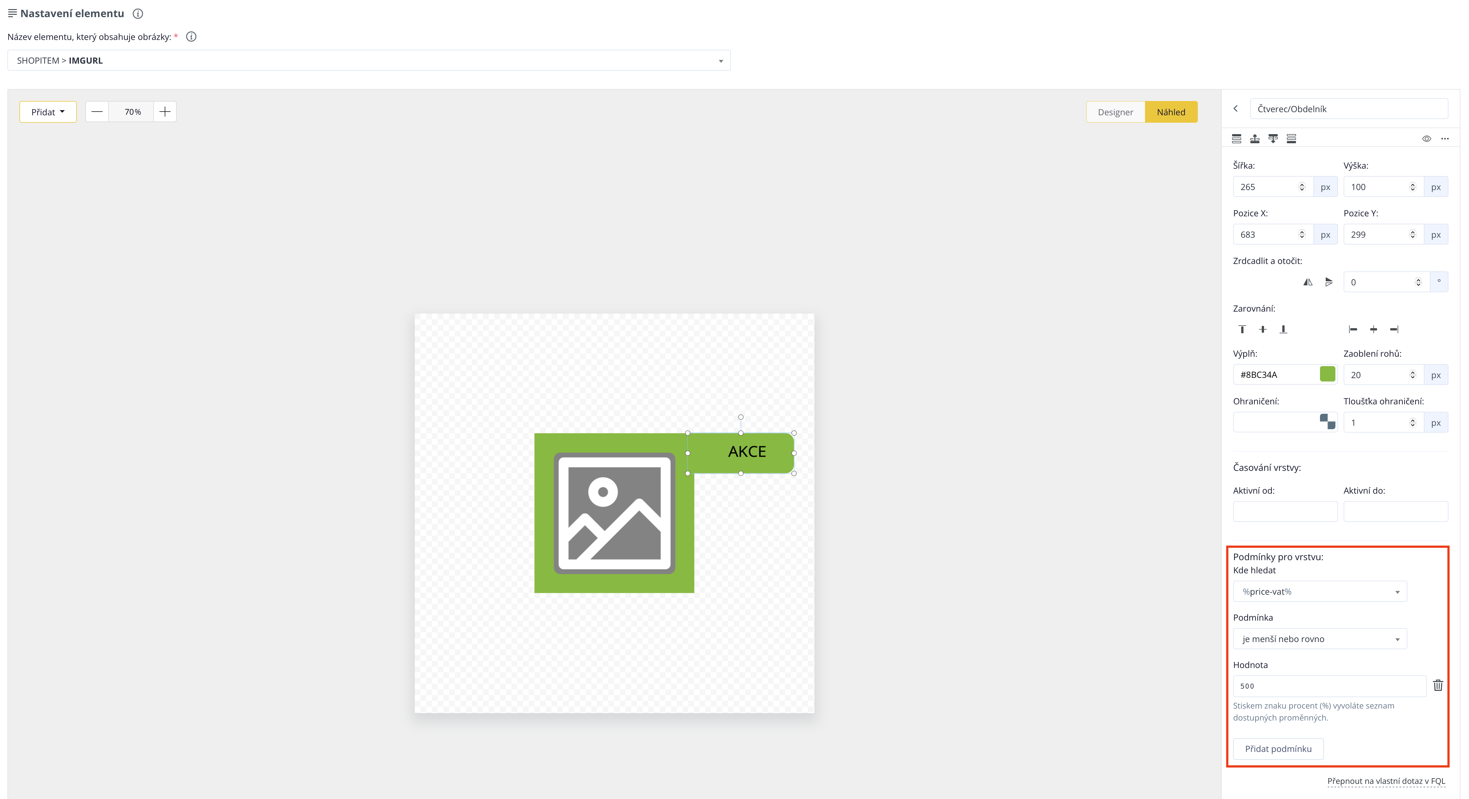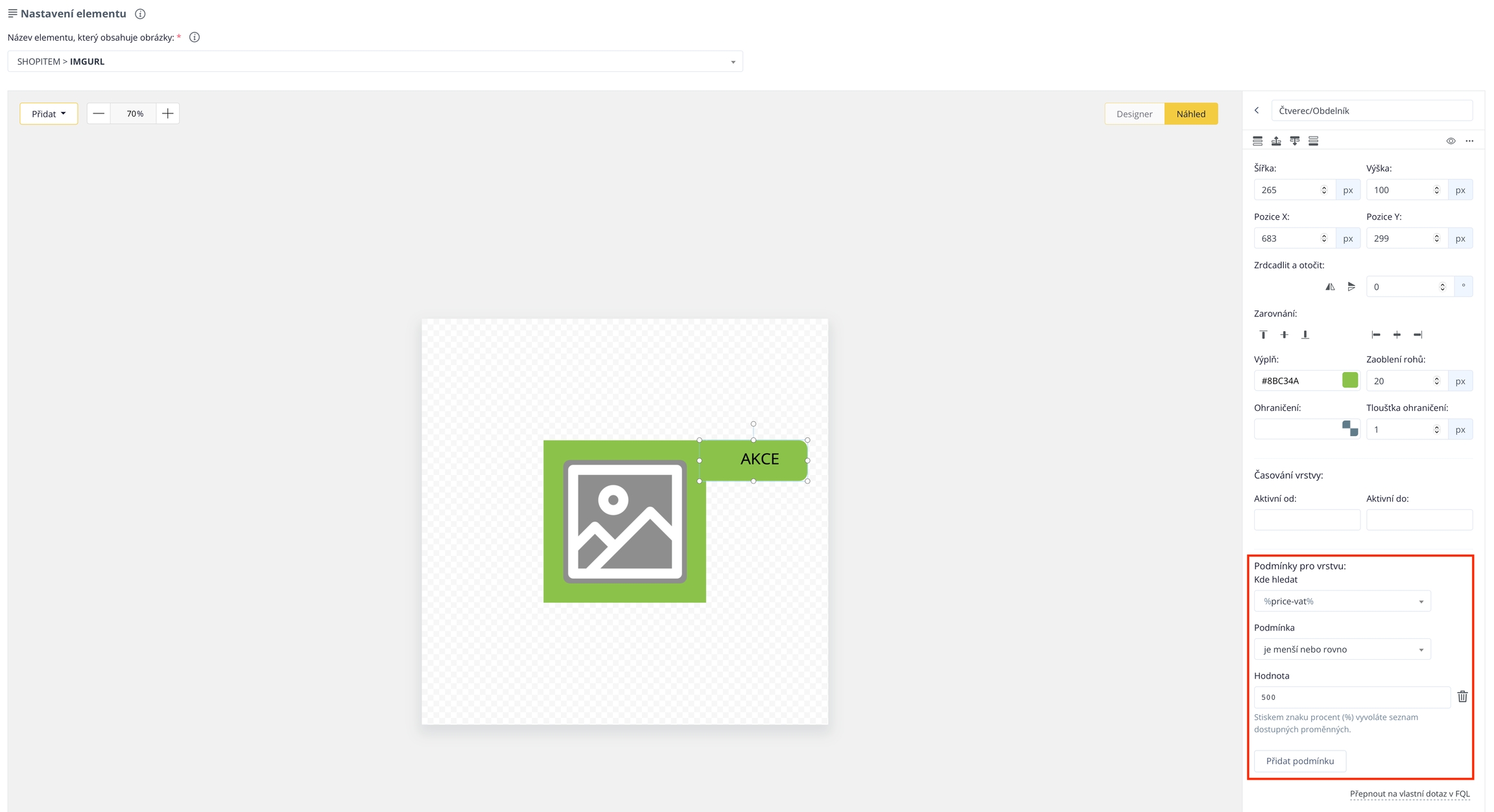 Als nächstes fügen wir der Bearbeitung des Etiketts eine Bedingung hinzu. In das Feld "Wo suchen" geben wir diese Variable %price-vat% ein, als Bedingung wählen wir "ist kleiner oder gleich", und wir wählen den Wert "500". Diese Bedingung bestimmt, dass jedes Produkt, dessen Preis kleiner oder gleich 500,- Kč ist, das Etikett mit der Aufschrift "AKCE" enthält, das wir erstellt haben.