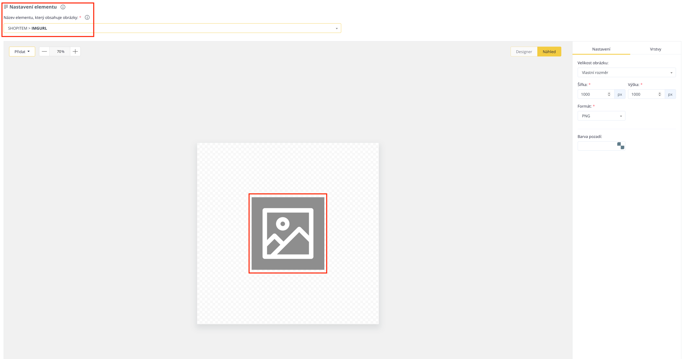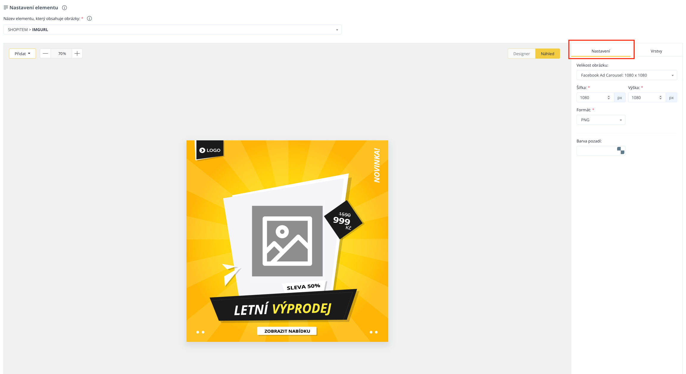 Zum Schluss gibt es hier die Einstellungen, wo Sie mehrere voreingestellte Größen für verschiedene Verwendungszwecke finden. Dies sind beispielsweise Größen, die für den Mall Marketplace, Heureka, Facebook und andere Plattformen bestimmt sind. Neben der Größe können Sie auch das Format der Vorlage wählen, entweder PNG oder JPG.