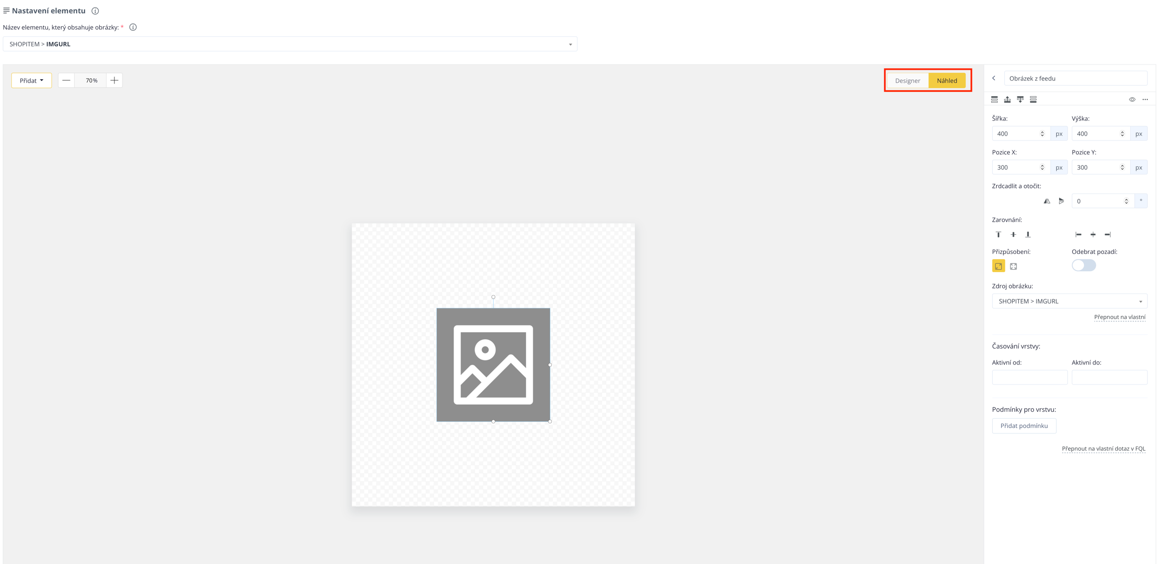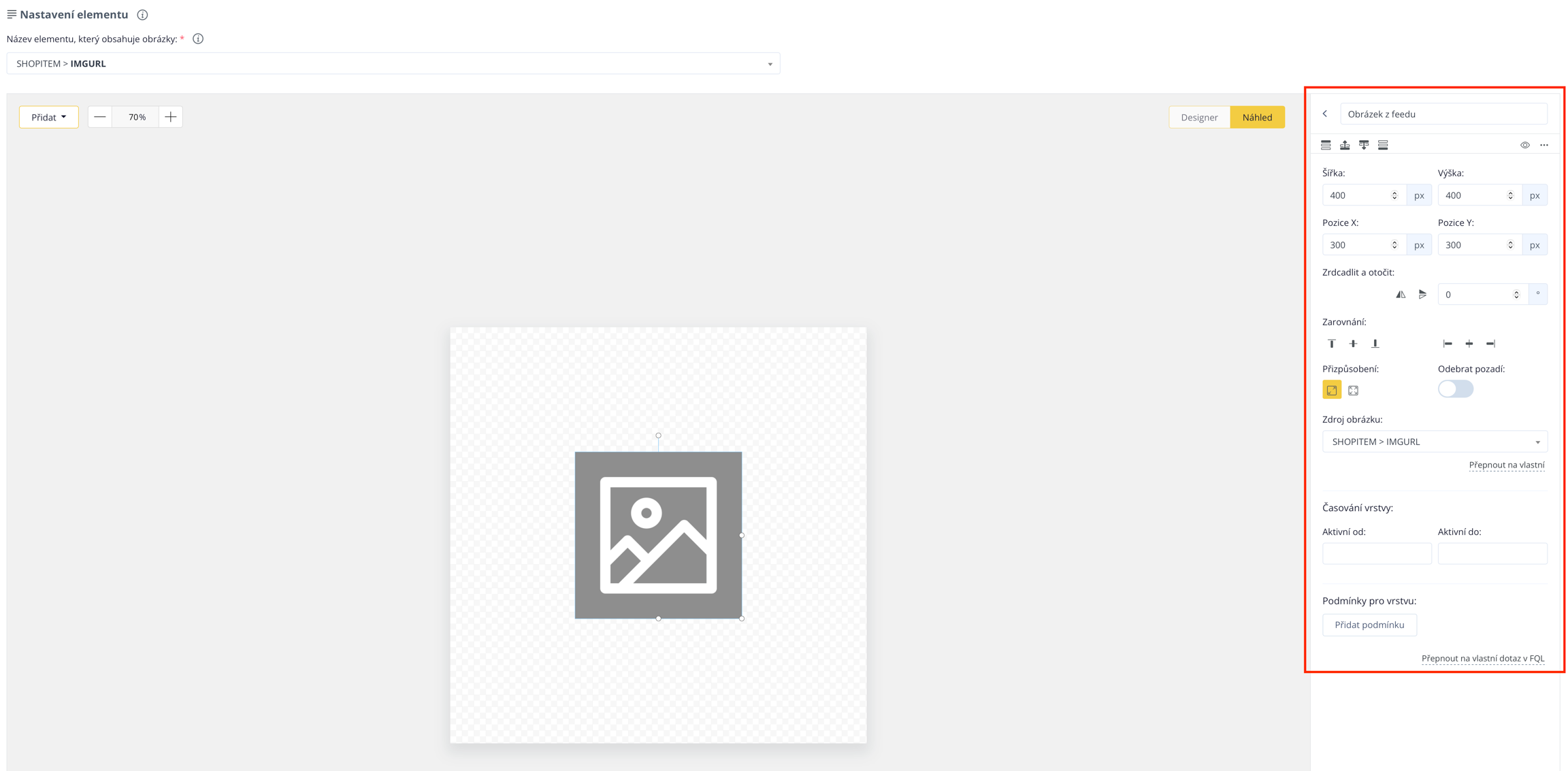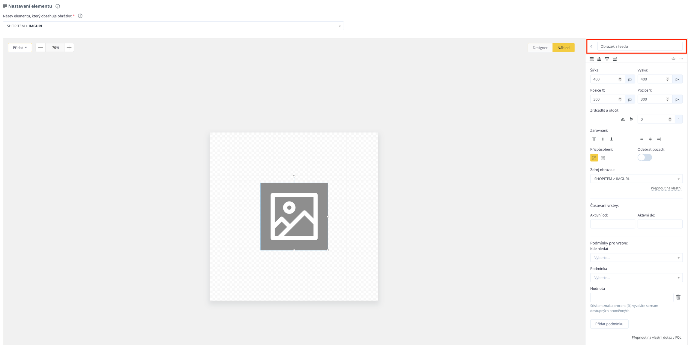 In den Einstellungen des Elements wählen Sie die Quelle aus, aus der Conviu die Informationen beziehen soll. Am häufigsten handelt es sich um den IMGURL-Link aus dem Quell-Feed, der das Produktbild enthält. Nachdem Sie diesen eingegeben haben, wird automatisch ein Platzhalterbild auf der Leinwand angezeigt.