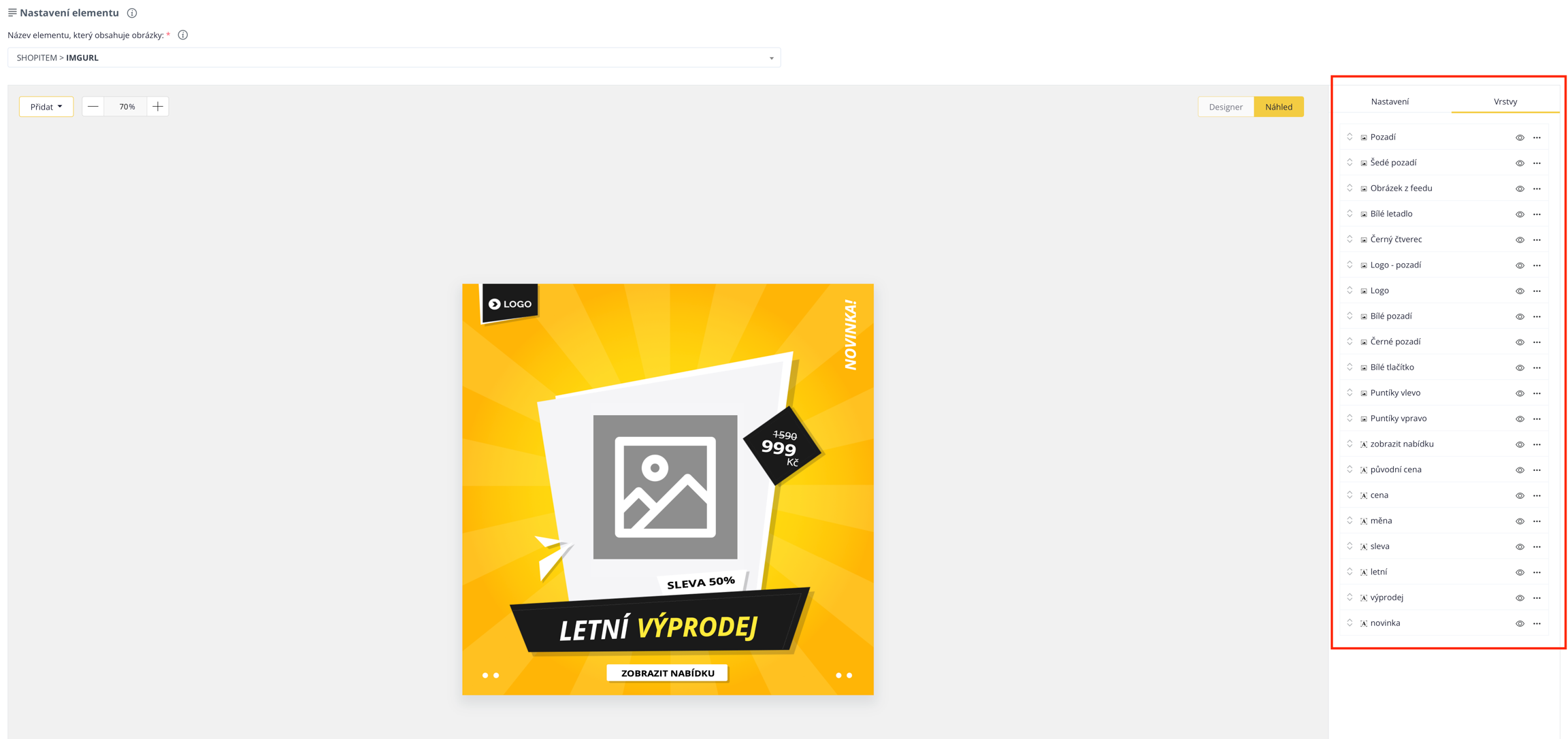 Im Bildeditor können Sie Ihrem Produktlogo, Aktionspreislabels, verschiedenen Texten, farbigen Hintergründen oder einer von Ihnen ausgewählten Vorlage hinzufügen. Darüber hinaus ermöglicht es auch die Zeitsynchronisierung einzelner Ebenen, das Hinzufügen verschiedener Bedingungen für jede Ebene und andere fortgeschrittene Funktionen, die Sie aus Grafikprogrammen kennen.