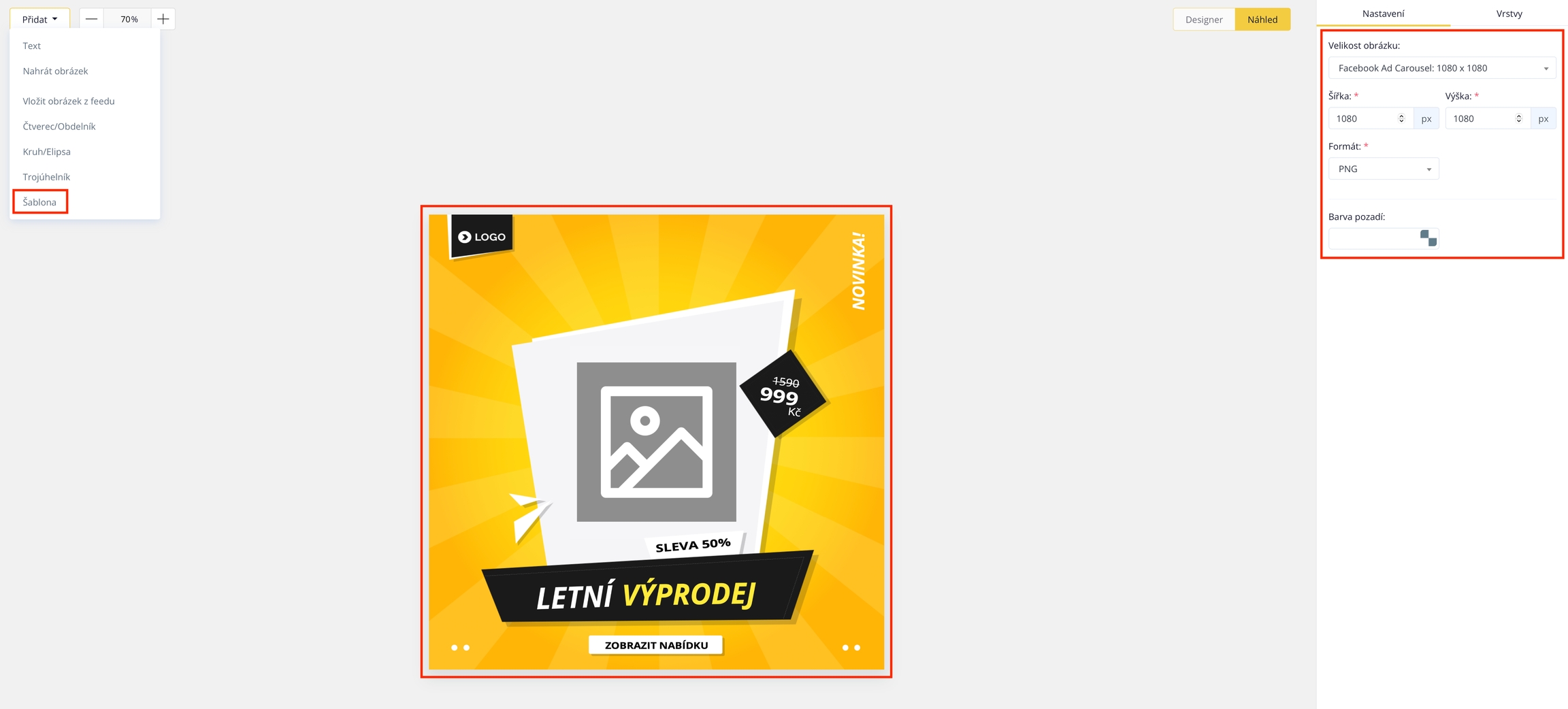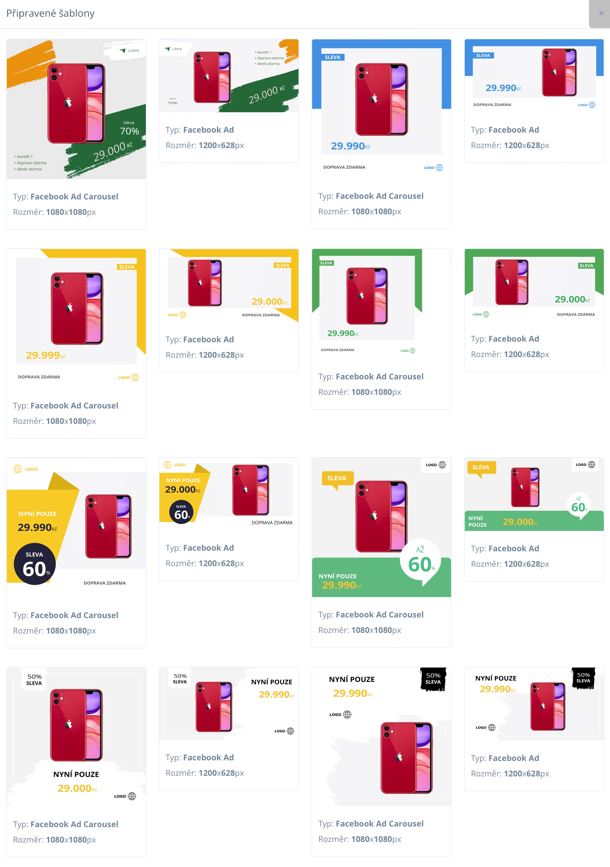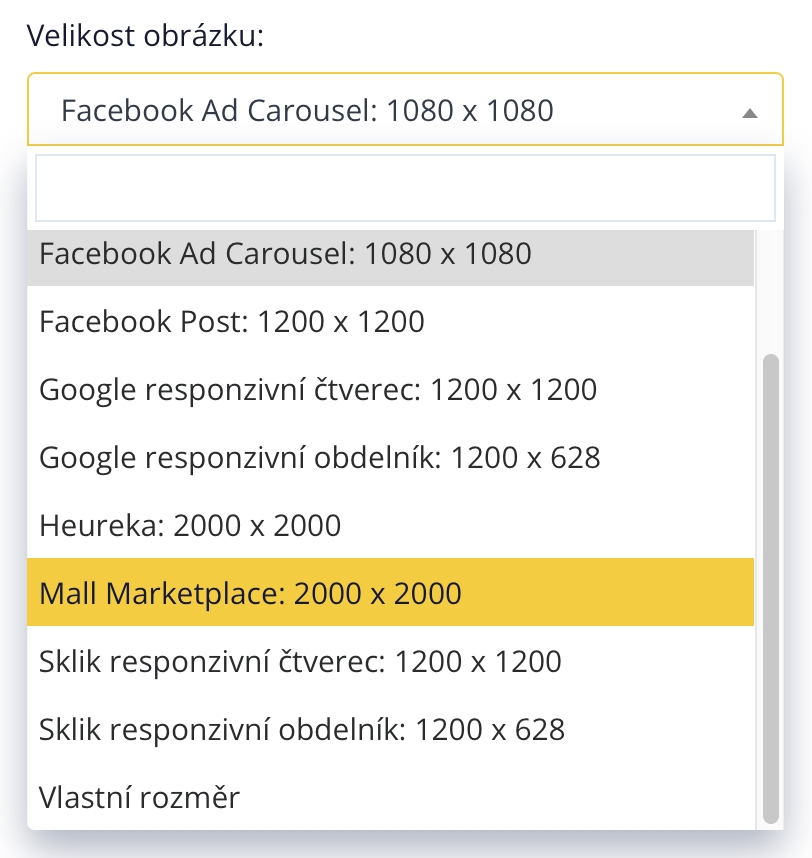 Bildgröße - Nach dem Klicken können Sie eine der voreingestellten Größen der jeweiligen Vorlage auswählen, die beispielsweise für Facebook, Google, Heureka und andere Plattformen vorgesehen sind. Wenn keiner der voreingestellten Formate Ihren Anforderungen entspricht, können Sie auch eine benutzerdefinierte Größe wählen.