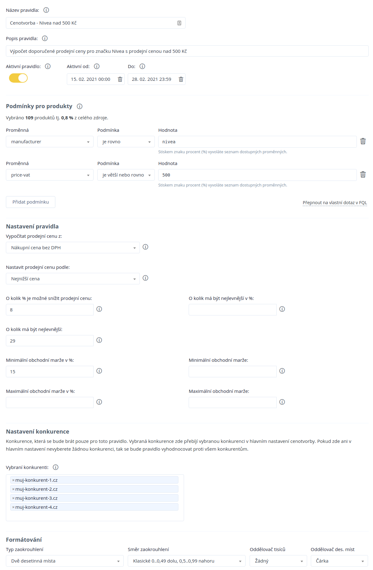 Die maximale und minimale Marge kann in Prozent oder in CZK eingestellt werden.