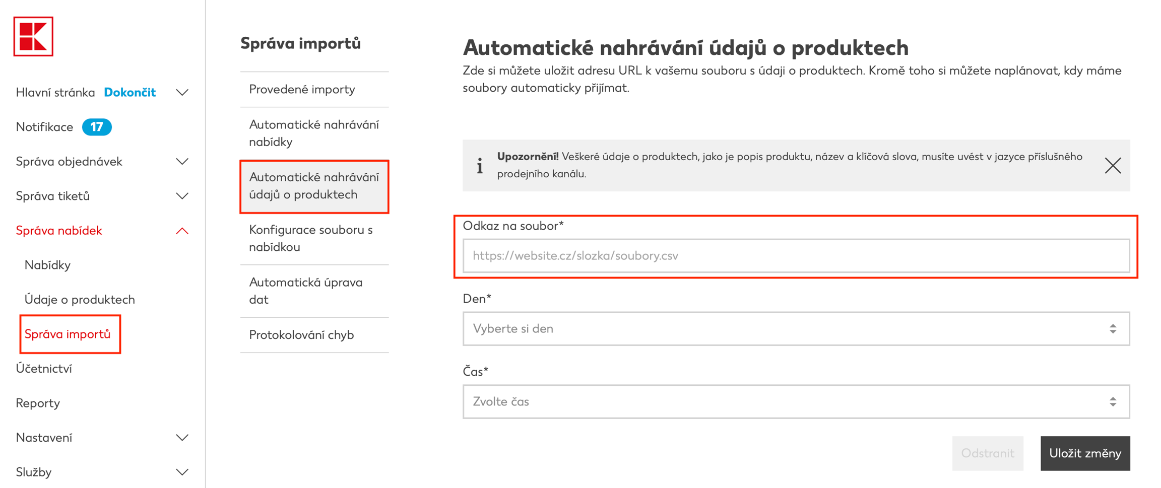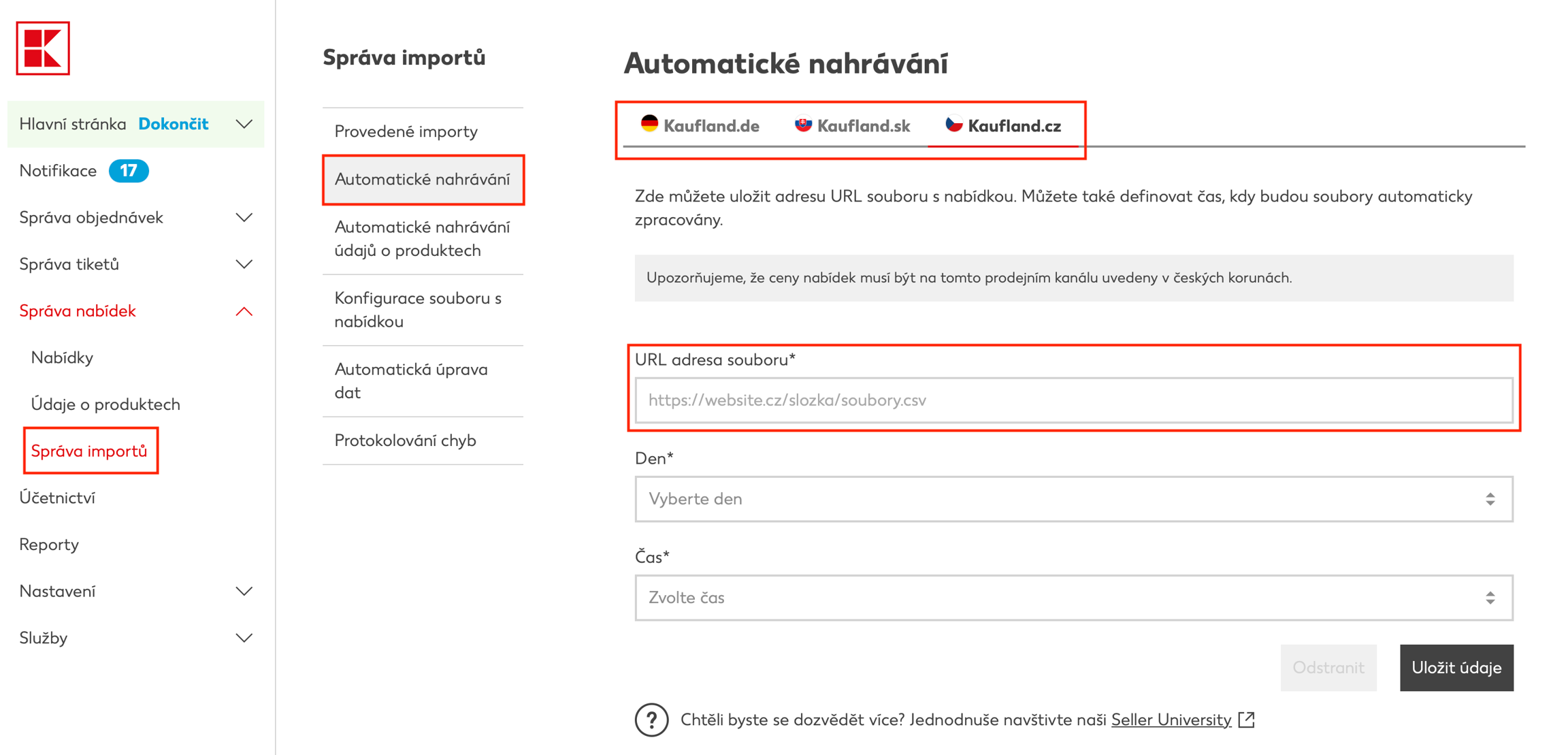 Zuerst müssen Sie sich registrieren zaregistrovat do administrace Kaufland aDen Import von Daten in Conviu einrichten. Am häufigsten wird das XML-Feed-Format von Heureka verwendet, aber auch über Custom formátu (import vlastního XML) Sie können den Import von beliebigen XML-Feeds durchführen.
