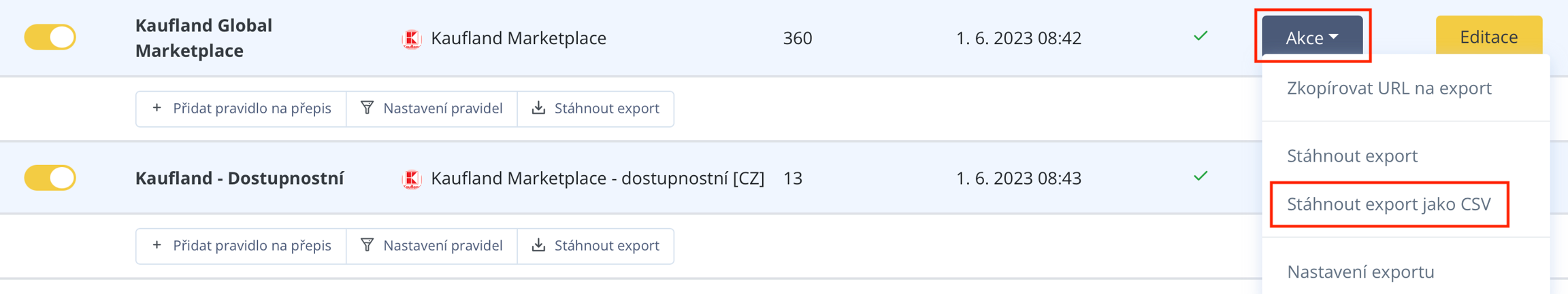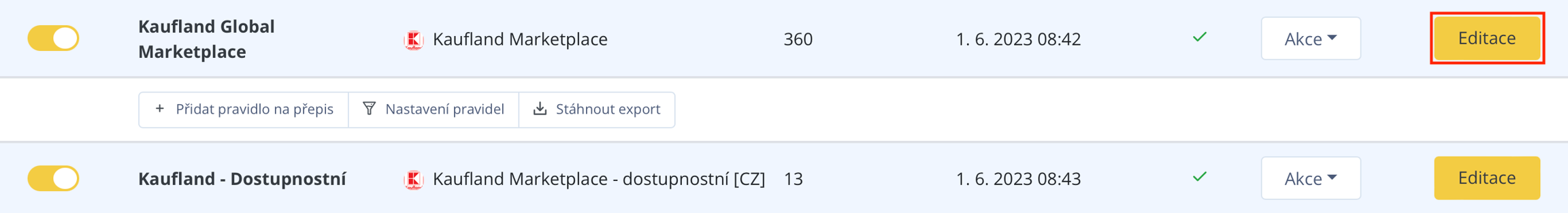 Kaufland Global Marketplace ermöglicht es Ihnen, nicht nur auf dem tschechischen, sondern auch auf dem slowakischen oder deutschen Marktplatz zu verkaufen. Um den Feed jedoch auch für diese Marktplätze verwenden zu können, müssen einige Anpassungen vorgenommen werden. Diese Anpassungen werden durch das Erstellen von Regeln in der Bearbeitung des entsprechenden Exports durchgeführ.