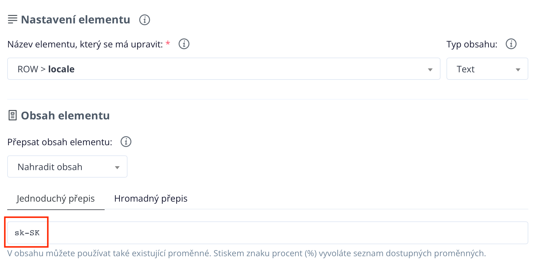 Zunächst muss die Lokalisierung des Feeds von 'cs-CZ' auf 'sk-SK' geändert werden, gegebenenfalls auch auf 'de-DE'. Anschließend müssen Sie eine Regel zur Übersetzung des Feeds in die gewählte Sprache erstellen und im Verfügbarkeits-Feed gegebenenfalls die Währung in Euro ändern. Im untenstehenden Bild sehen Sie ein Beispiel für eine Regel zur Änderung der Lokalisierung für die Slowakei von 'cs-CZ' auf 'sk-SK.