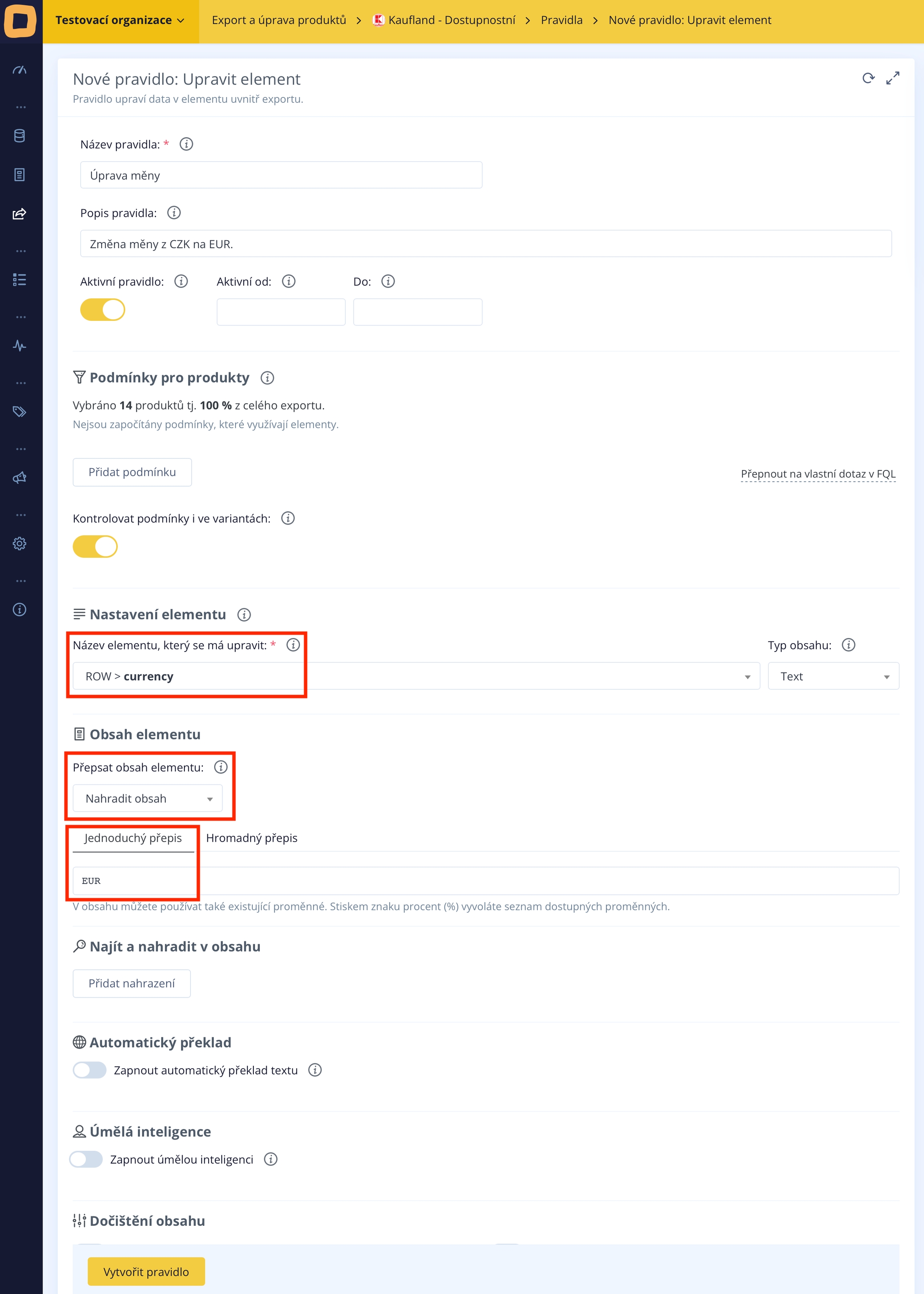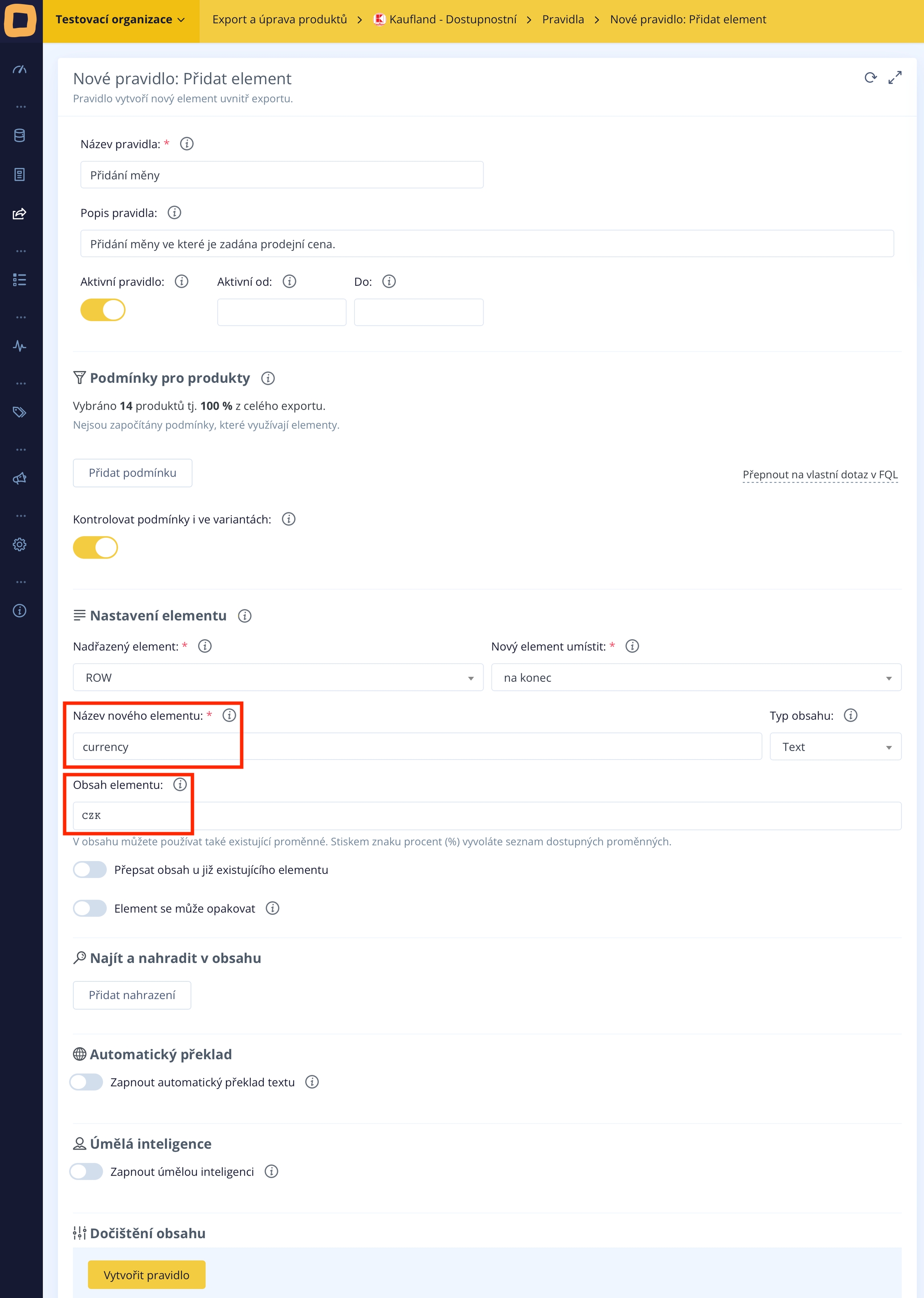 Zuerst wählen wir im 'Elementeinstellungen' den Namen des neuen Elements, das 'Währung' sein wird, und geben in das darunter liegende Feld mit dem Titel 'Elementinhalt' die Währung ein, in der der Verkaufspreis angegeben ist, zum Beispiel 'CZK' für Kronen. Falls der Verkaufspreis im Feed in Euro angegeben wäre, geben wir 'EUR' ein.