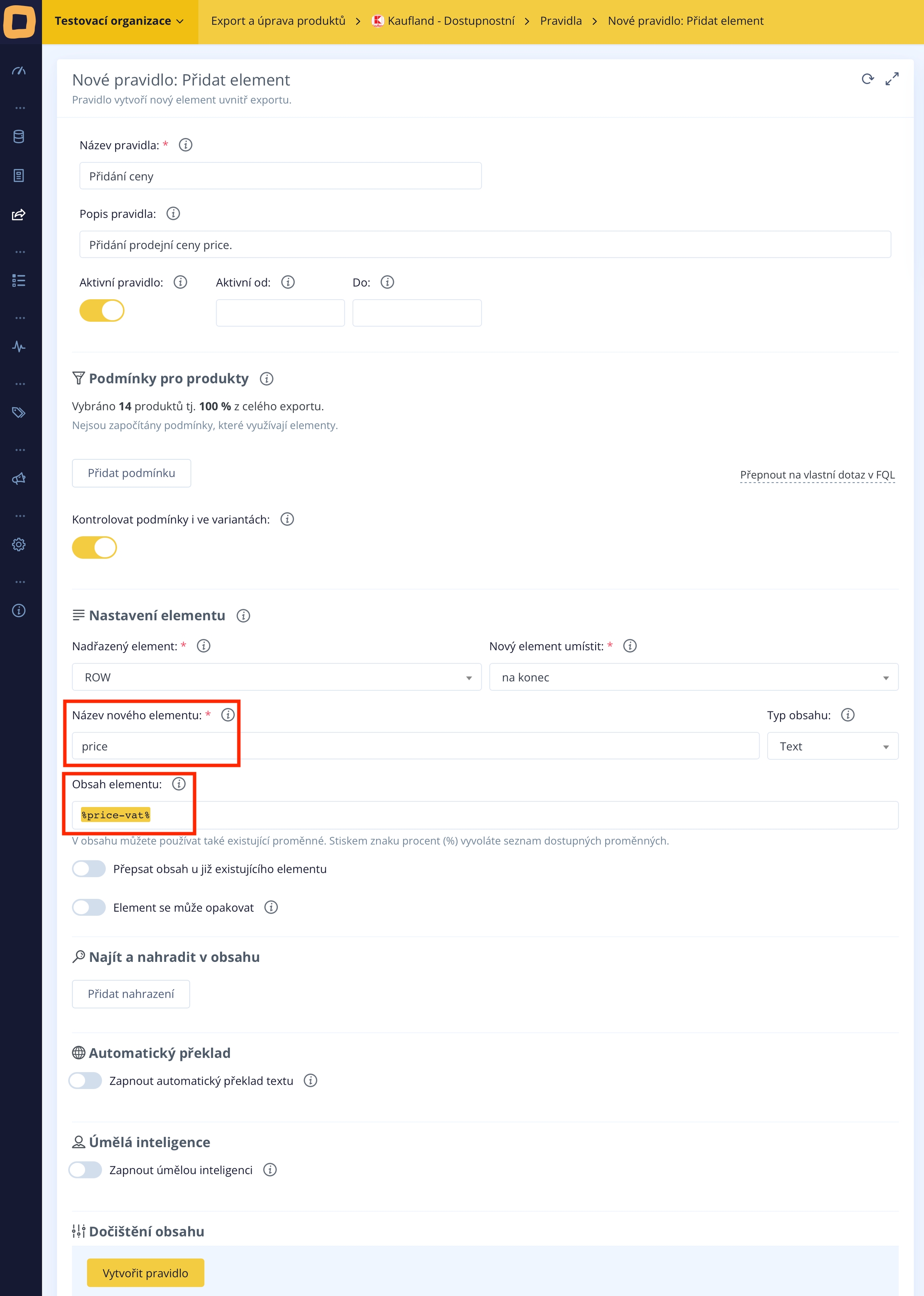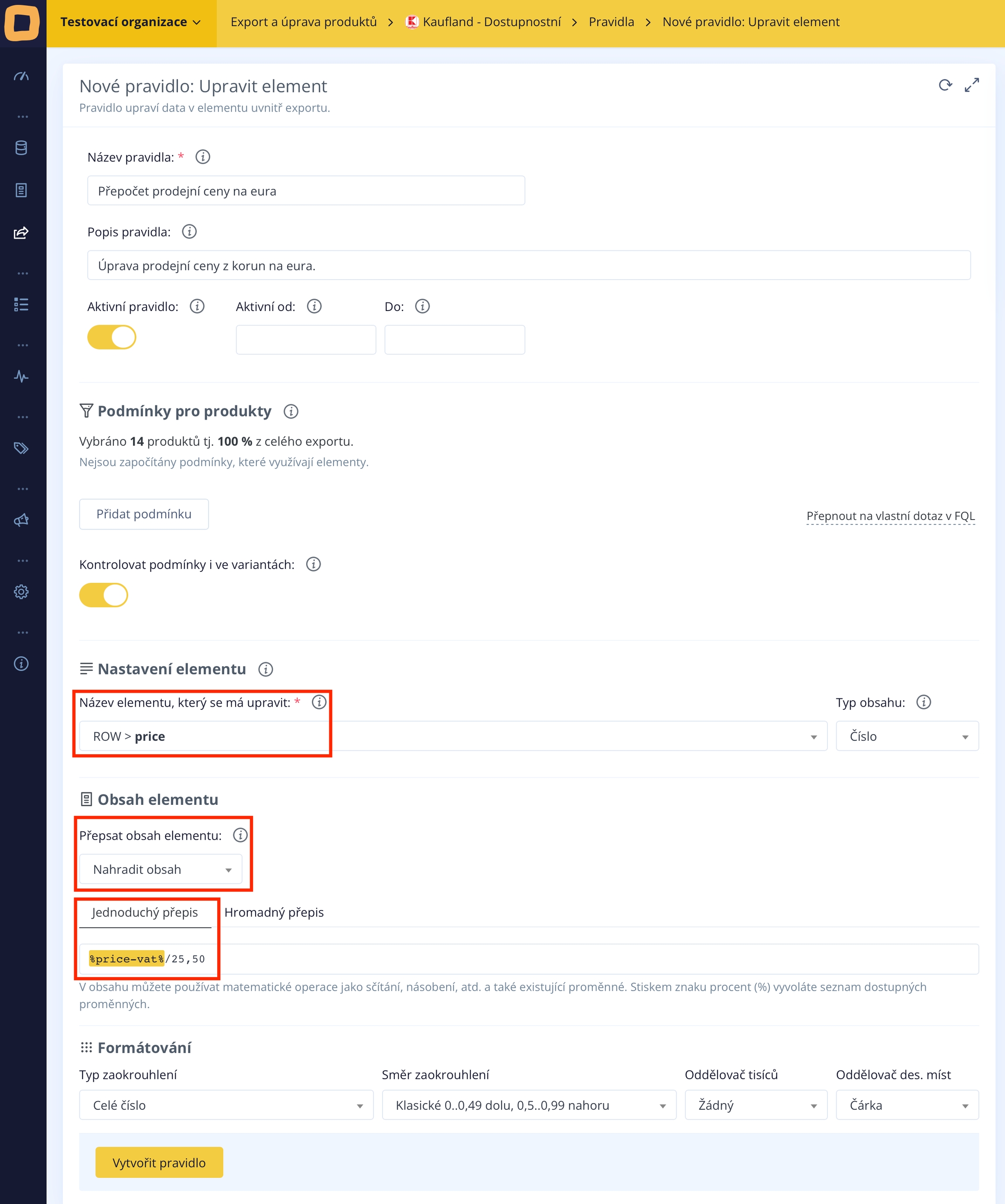 Wenn Sie den Verkaufspreis in Ihrem Verfügbarkeits-Feed von Kronen auf Euro ändern oder umgekehrt möchten, müssen Sie lediglich eine Regel zum Hinzufügen des Preises oder zu seiner eventuellen Umrechnung erstellen