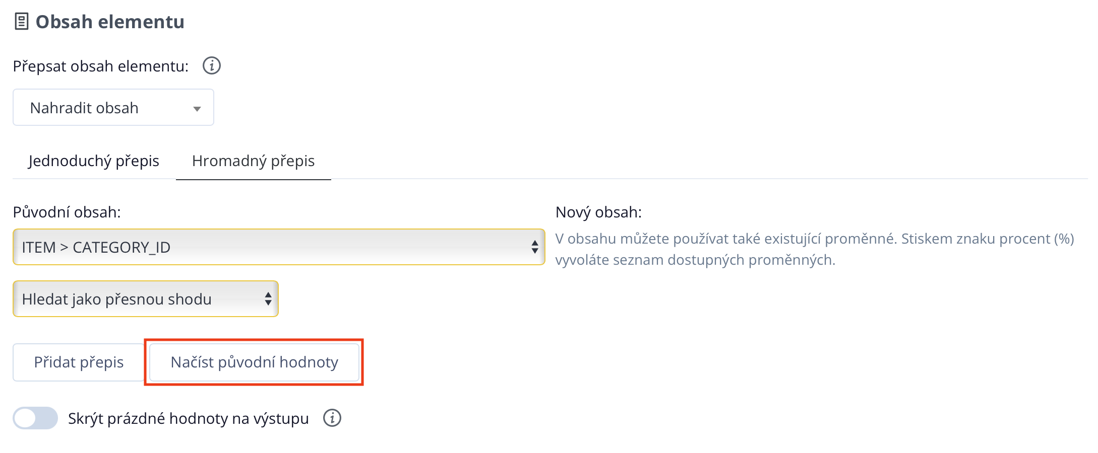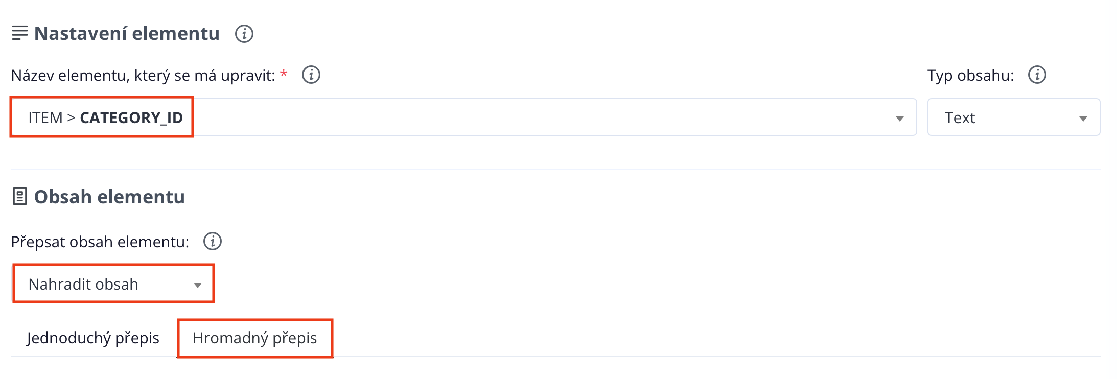 Dann wählen Sie im Elementeinstellungs-Menü das Element aus, in dem sich die Kategorien der Produkte befinden. In unserem Fall ist es "ITEM > CATEGORY\_ID". Danach wählen Sie im Elementinhalt "Inhalt ersetzen" und wechseln zu "Massenersatz".