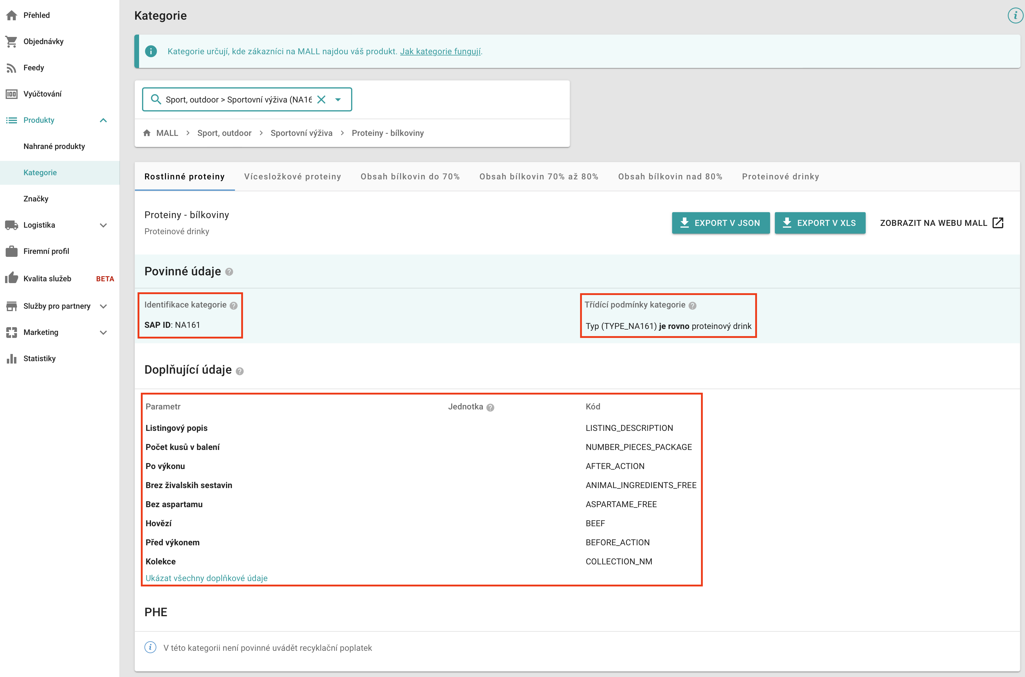 Nachdem wir die ausgewählte Kategorie angeklickt haben, werden ihre Details angezeigt. In diesen Details wird der Kategoriecode angezeigt und es werden auch alle obligatorischen und zusätzlichen Parameter angezeigt. Jeder der obligatorischen Parameter muss für die entsprechende Kategorie ausgefüllt werden. Wenn sich im Feed auch Informationen befinden, die in den "Zusätzlichen Parametern" enthalten sind, ist es ratsam, sie ebenfalls hinzuzufügen.