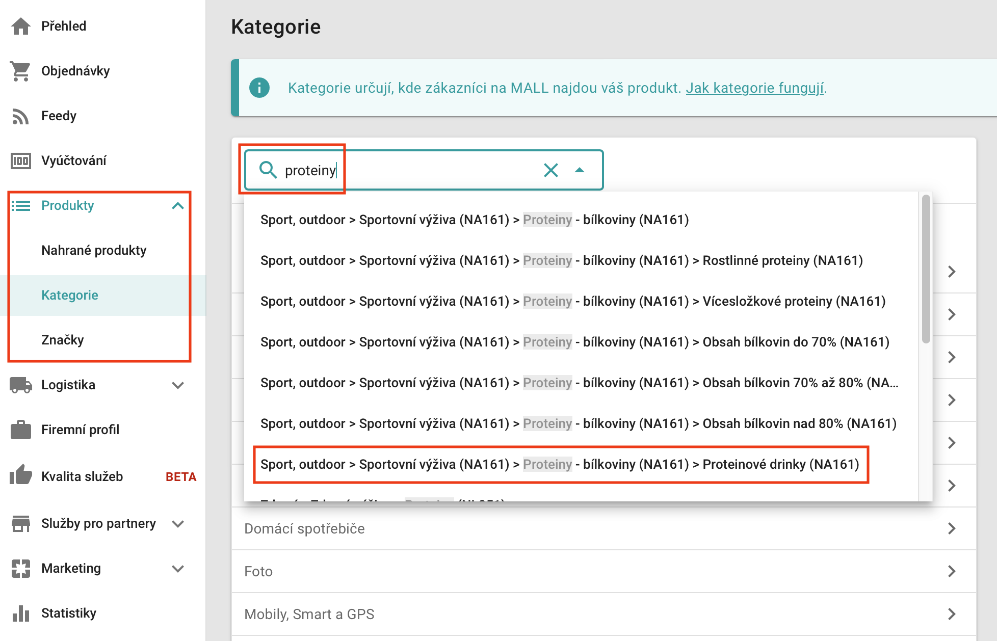 **1) Durch die Verwaltung auf Mall** - Wir loggen uns in die Mall-Verwaltung ein und finden im Bereich "Produkte" den Tab "Kategorien". Dann geben wir das Wort "Proteine" in das Suchfeld ein. Der Autovervollständigungsmechanismus zeigt uns dann verschiedene Kategorien an, in denen das Wort "Proteine" vorkommt. Es reicht dann aus, die gewählte Kategorie auszuwählen. In unserem Fall die Kategorie *„Proteinové drinky (NA161)"*.