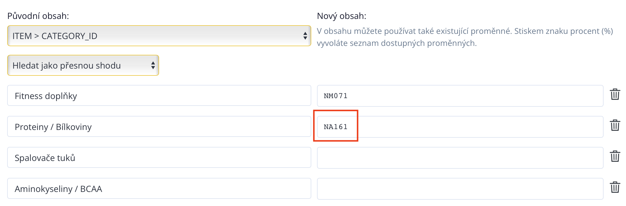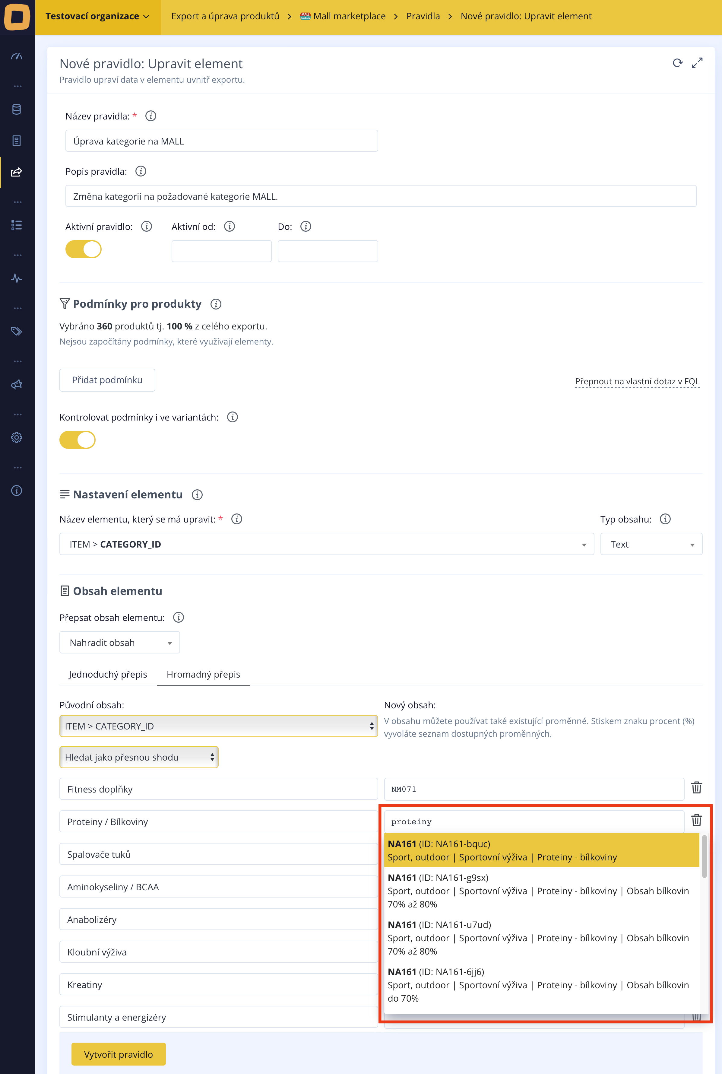 **2) Mithilfe des Autovervollständigers in Conviu** - Um während der Einstellung der Regel nicht in die Mall-Verwaltung wechseln zu müssen, können wir den Autovervollständiger in Conviu verwenden. Geben Sie einfach in eine leere Spalte auf der rechten Seite, in unserem Fall das Wort "Proteine", ein und es wird Ihnen dieselbe Auswahl möglicher Kategorien angezeigt wie in der Mall-Verwaltung. Wählen Sie dann einfach die gewünschte Kategorie aus, und ihr Code wird automatisch in die Spalte eingefügt.