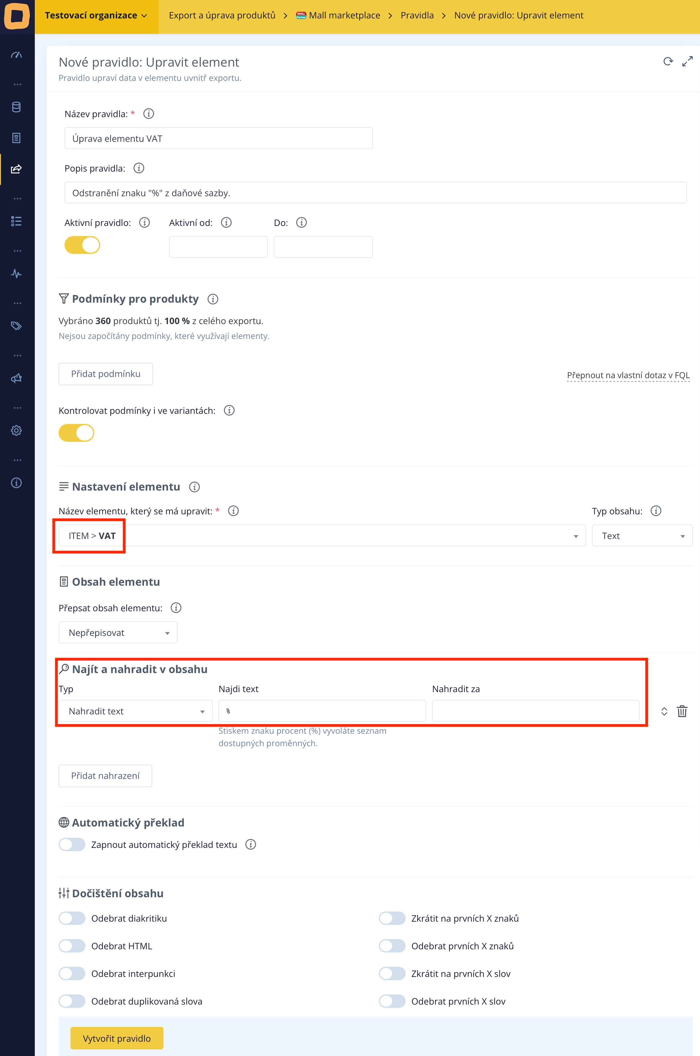 Mall verlangt in seinen Feeds, dass das Element mit dem Steuersatzwert das Prozentzeichen (%) nicht enthält. Um dieses Zeichen zu entfernen, genügt es, eine einfache Regel zu erstellen.