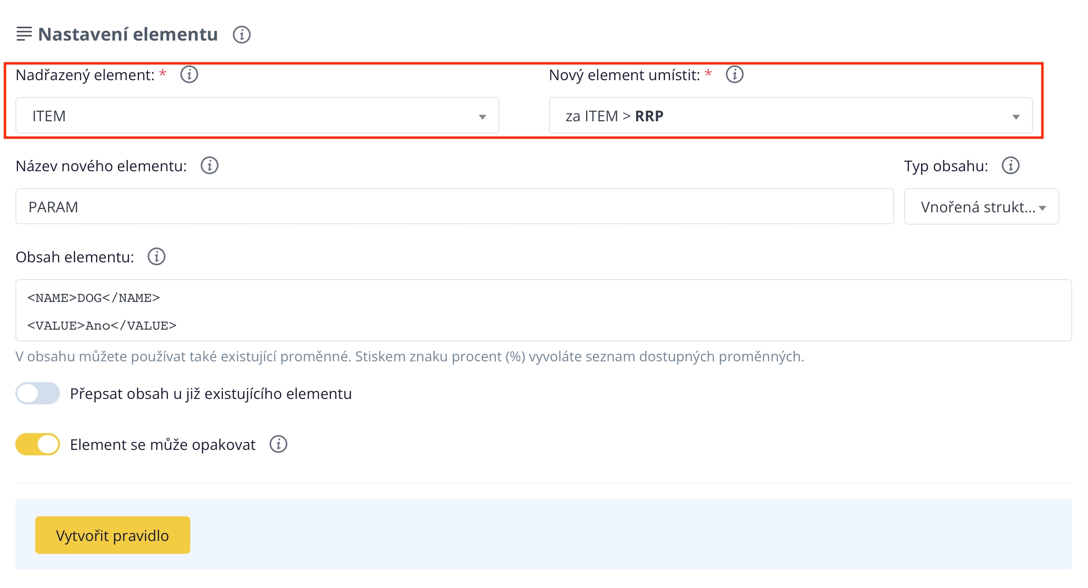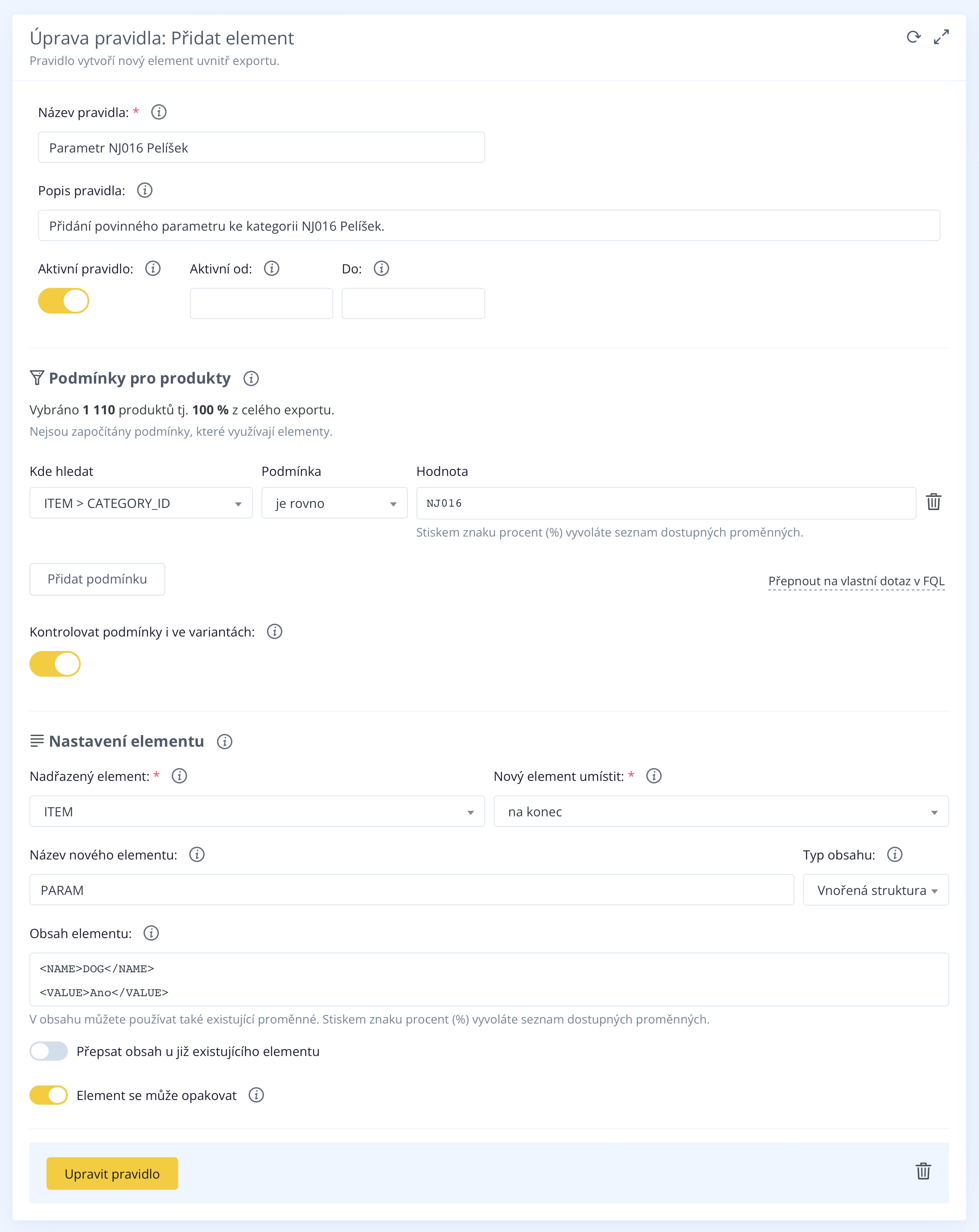 Im Bild unten sehen Sie ein Beispiel für eine Regel zur Erstellung von Parametern. Details zur Einrichtung dieser Regel finden Sie in der Hilfe Přidání povinných parametrů PARAM ke kategorii Mall.