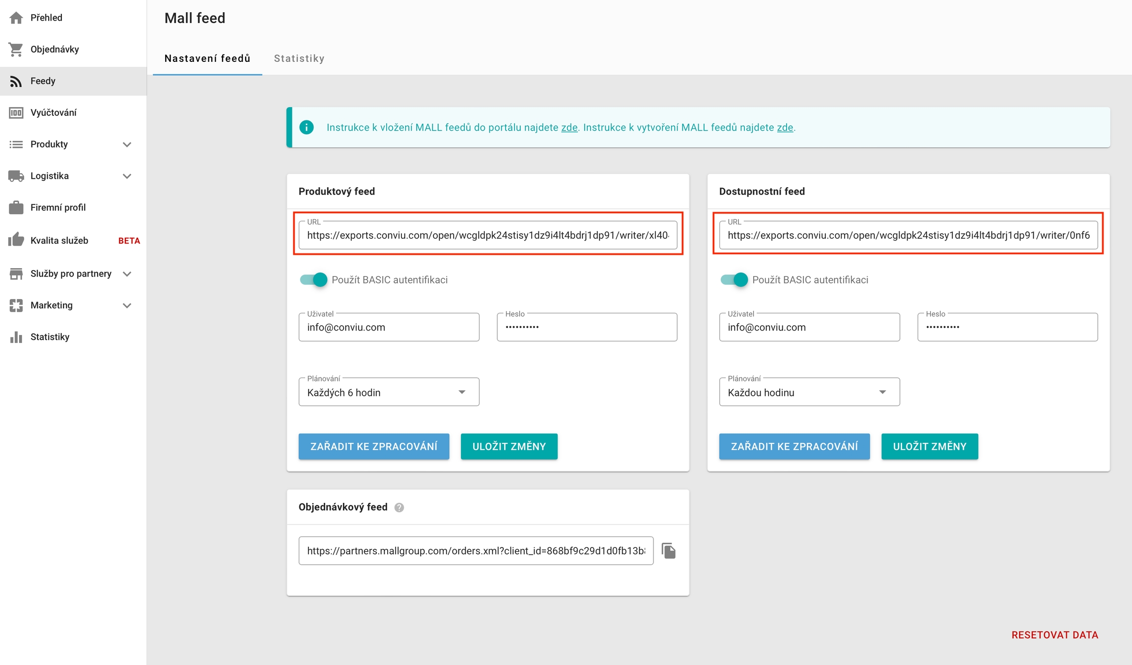 Zuerst ist es notwendig, sich zu zaregistrovat do administrace Mall Marketplace und dann müssen Sie den Datenimport in Conviu einrichten. Am häufigsten wird der XML-Feed von Heureka verwendet, aber auch über Custom formátu (import vlastního XML) sie können den Import von beliebigen XML-Feeds durchführen.