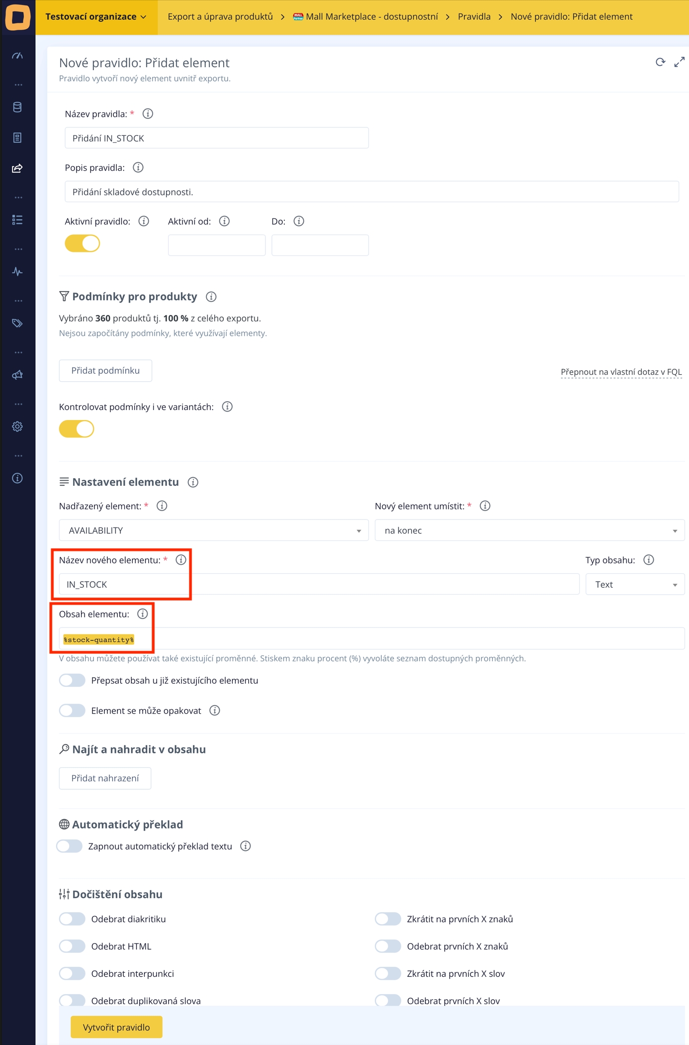 Eine der beiden häufigsten Regeln zur Anpassung des Verfügbarkeits-Feeds besteht darin, ein Element mit Lagerverfügbarkeit IN_STOCK hinzuzufügen.