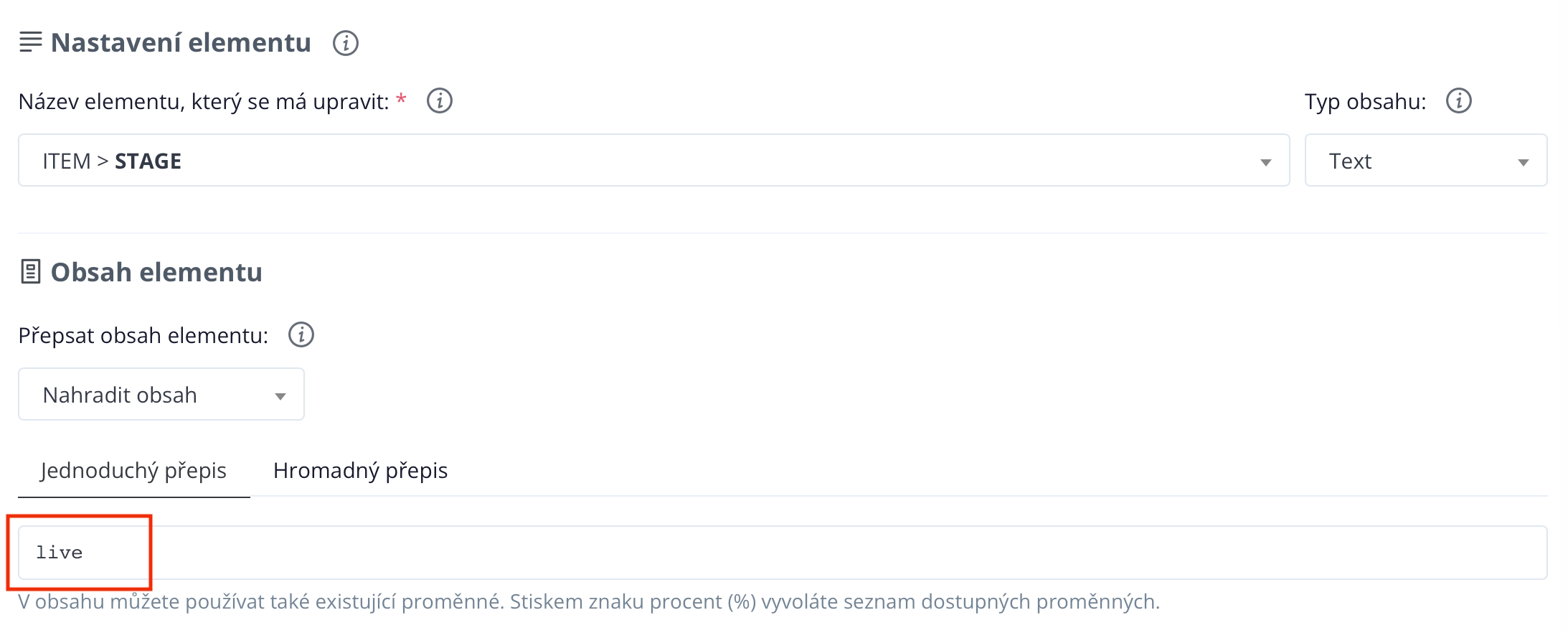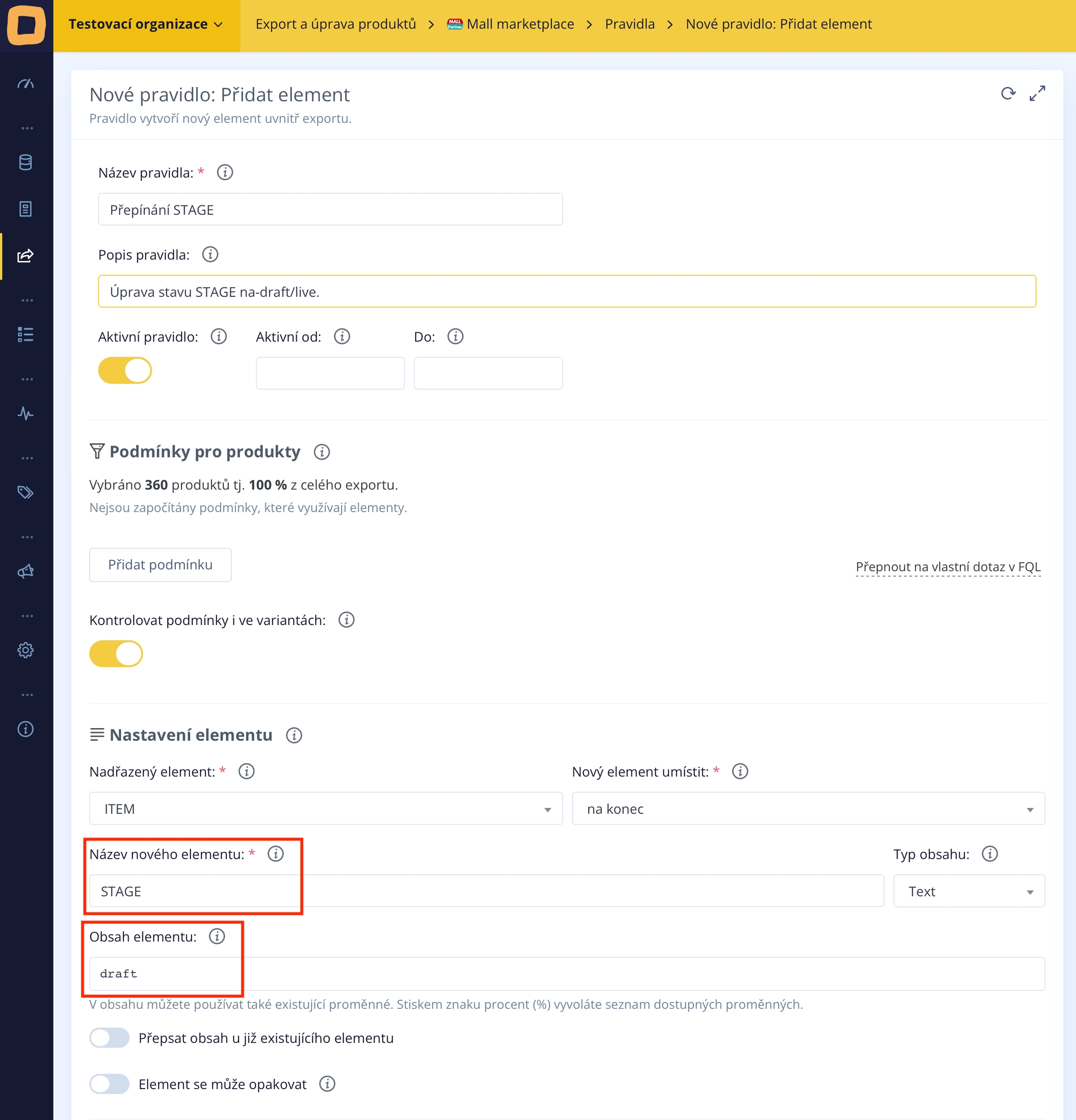 Anschließend erstellen wir einfach die Regel, und alle Produkte werden in den Status "Entwurf" versetzt. Im Falle, dass das Element "STAGE" bereits im Feed vorhanden ist und sich nicht im Zustand "Entwurf" befindet, erstellen wir erneut eine neue Regel, diesmal jedoch mit der Regel "Element bearbeiten". Im "Elementinhalt" überschreiben wir lediglich den Wert "live" durch "draft".