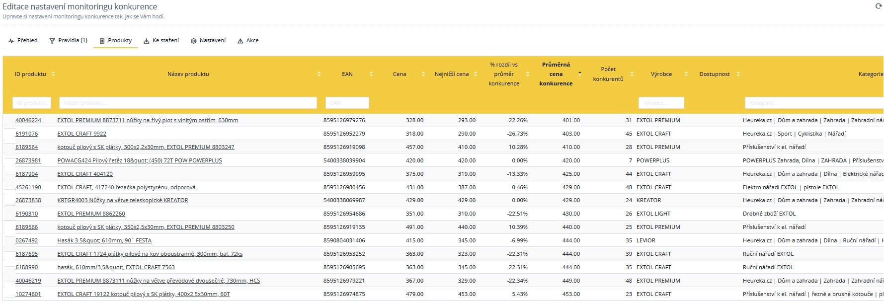 Prozentualer Unterschied unser Preis vs. Konkurrenz Durchschnitt - zeigt um wie viel Prozent sich Ihr Produktpreis im Vergleich zum Durchschnittspreis Ihrer ausgewählten Konkurrenz unterscheidet. Die einzelnen Zellen sind farblich markiert. Dadurch sehen Sie auf den ersten Blick, bei welchen Produkten Sie teurer (rot) oder günstiger (grün) im Vergleich zur Konkurrenz sind.