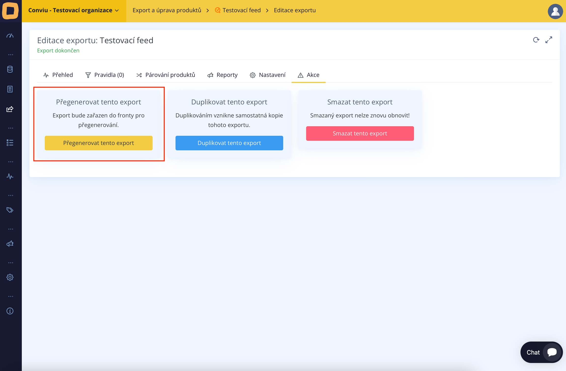 Wenn Sie möchten, dass die vorgenommene Änderung sofort wirksam wird, wechseln Sie in der Exportbearbeitung zum Tab "Aktionen" und klicken Sie auf "Diesen Export neu generieren".