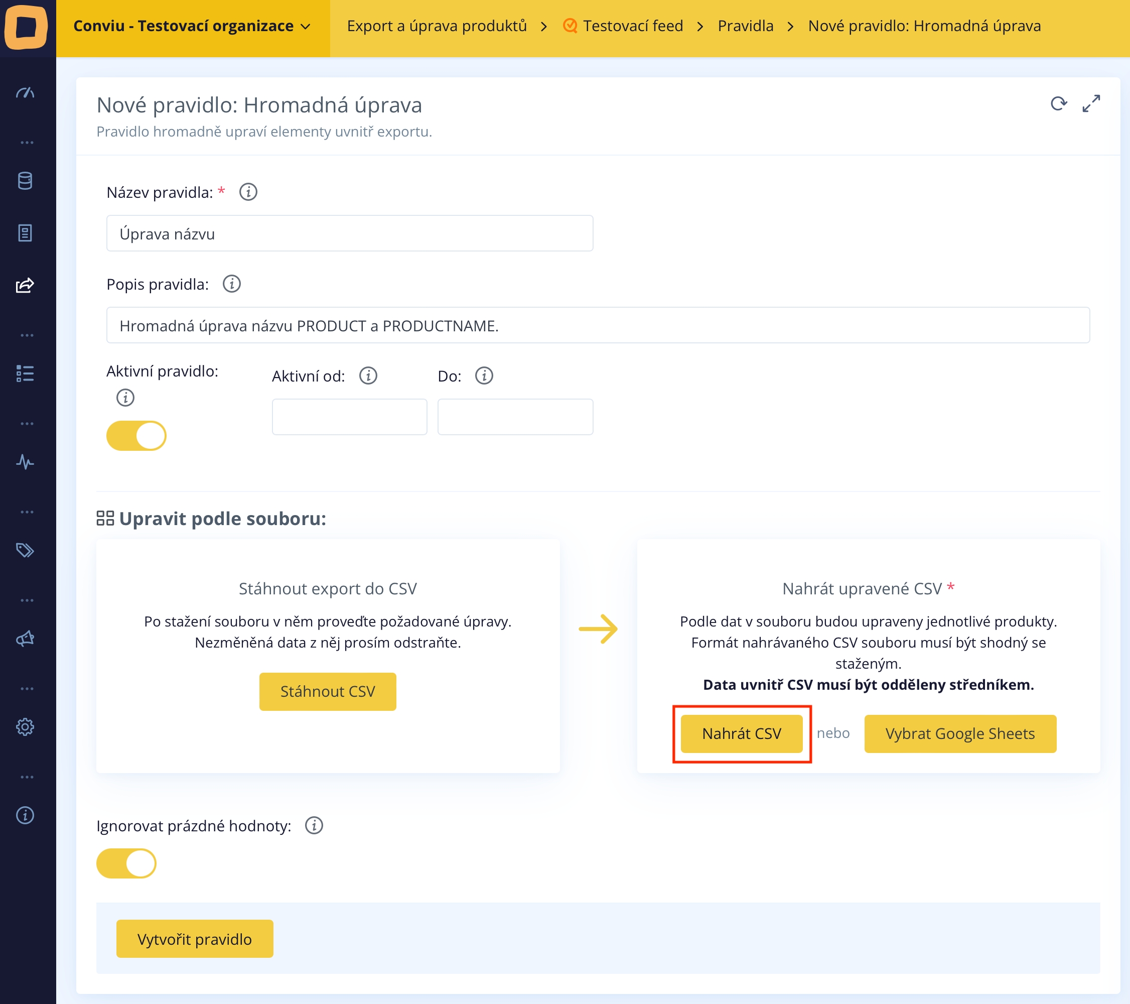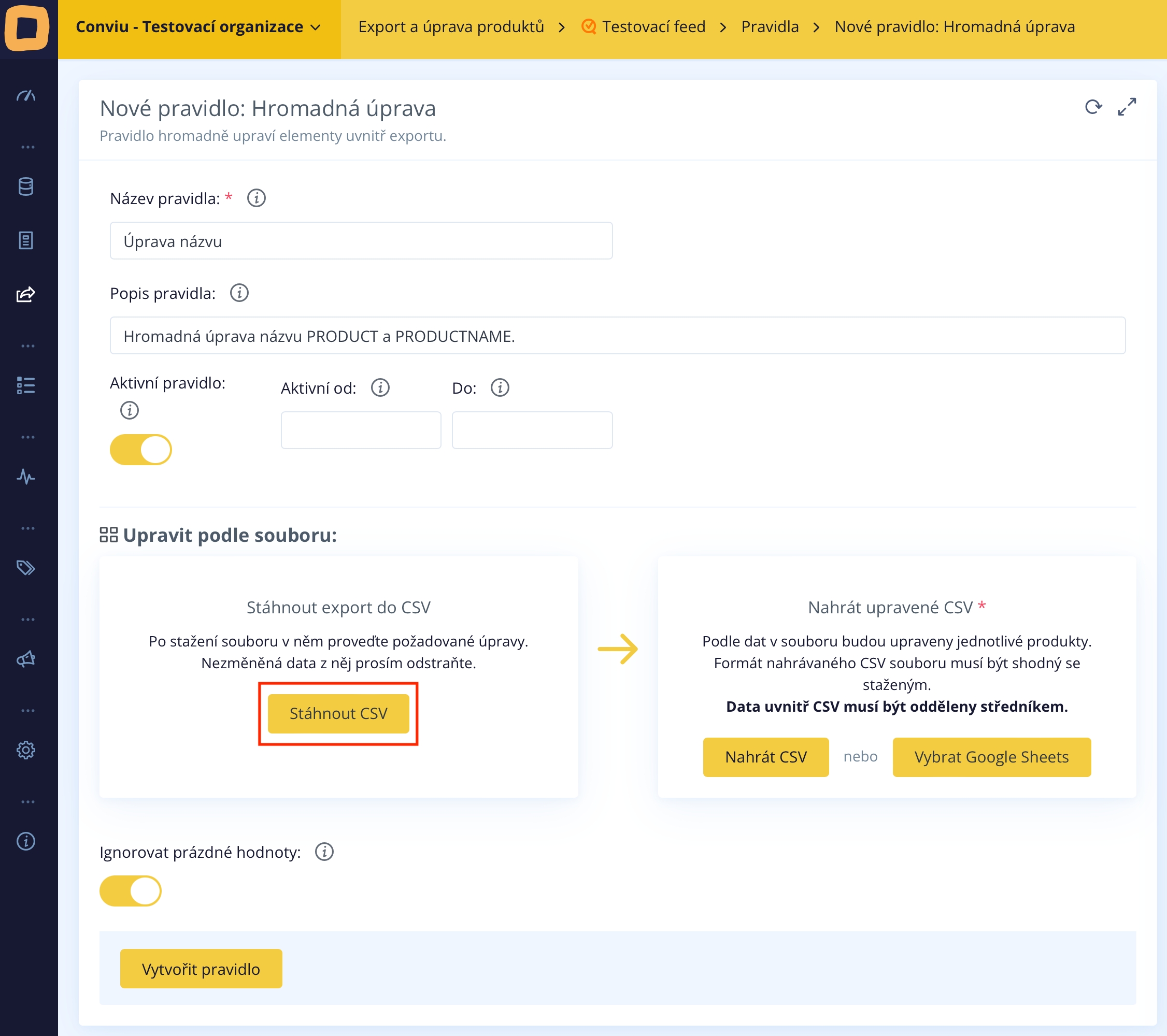 In der Regelbearbeitung klicken Sie dann auf "CSV herunterladen". Dadurch wird der ausgewählte Feed auf Ihren Computer heruntergeladen, den Sie bearbeiten werden.
