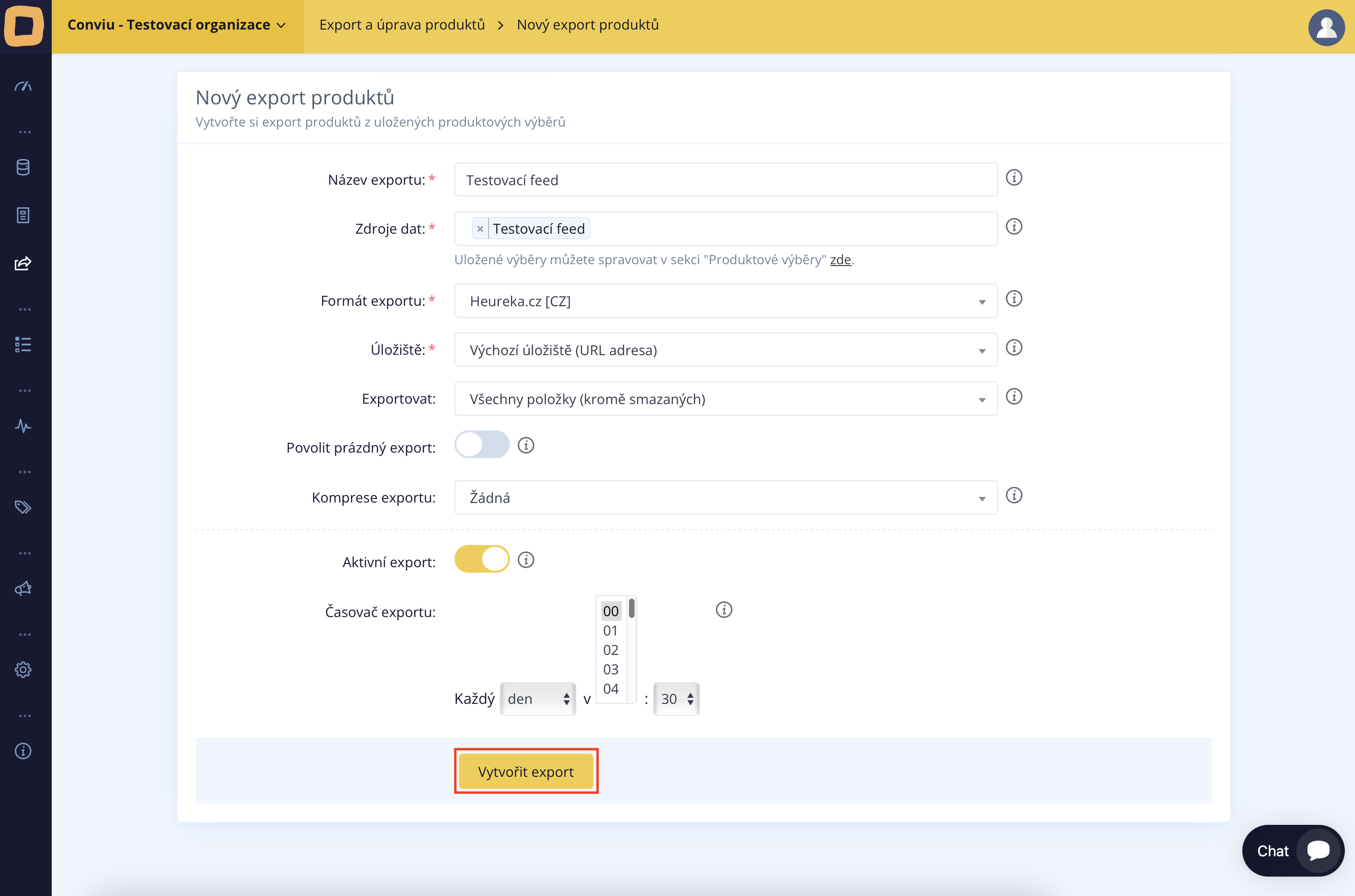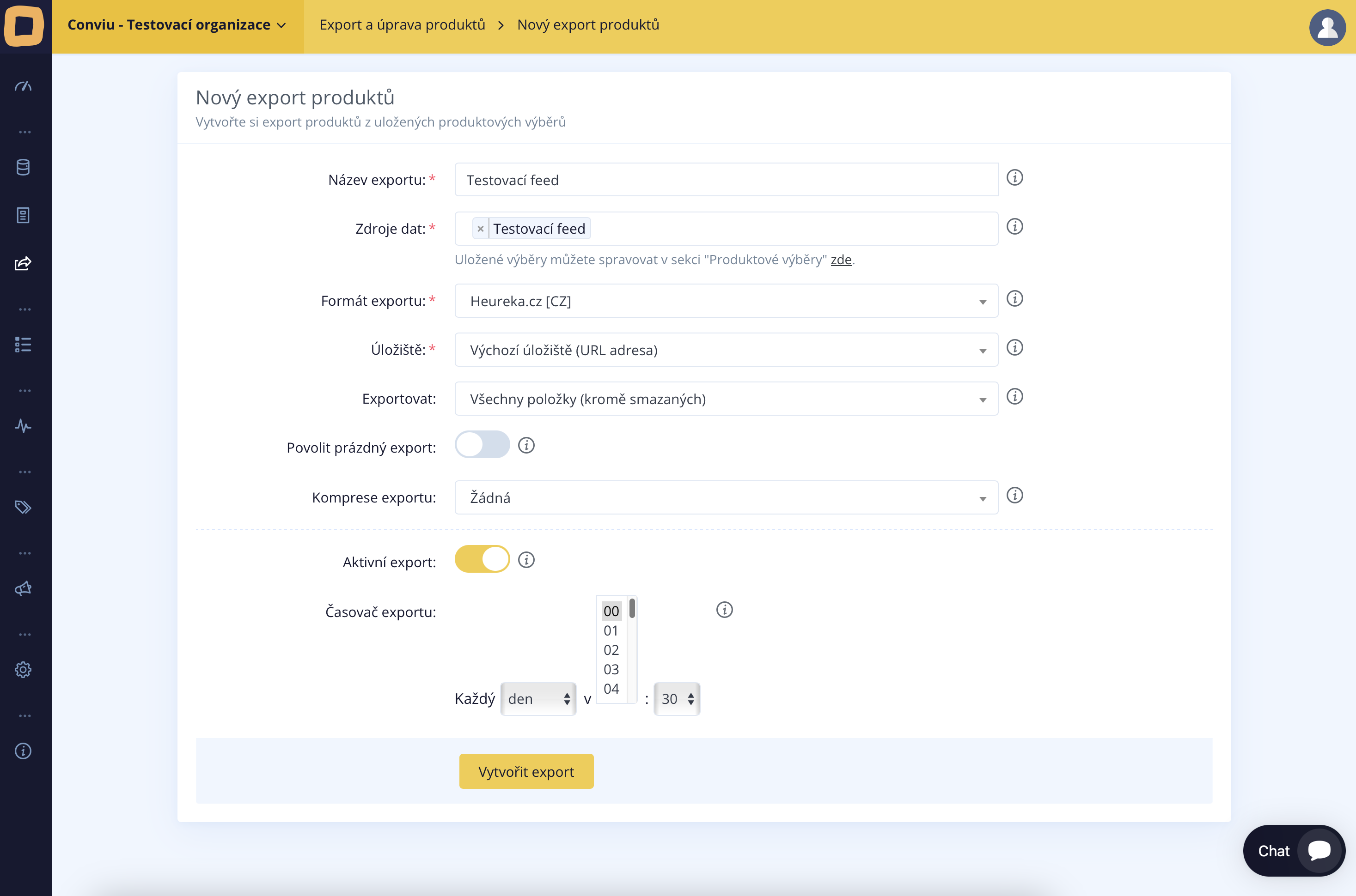 Daraufhin können Sie bereits die eigentliche Datenausfuhr einstellen. Es ist erforderlich, alle Pflichtangaben erneut auszufüllen, angefangen beim Exportnamen bis hin zur Zeitplanung. Im unten stehenden Bild sehen Sie ein Beispiel für die fertige Einstellung der Datenausfuhr im Heureka-Format.