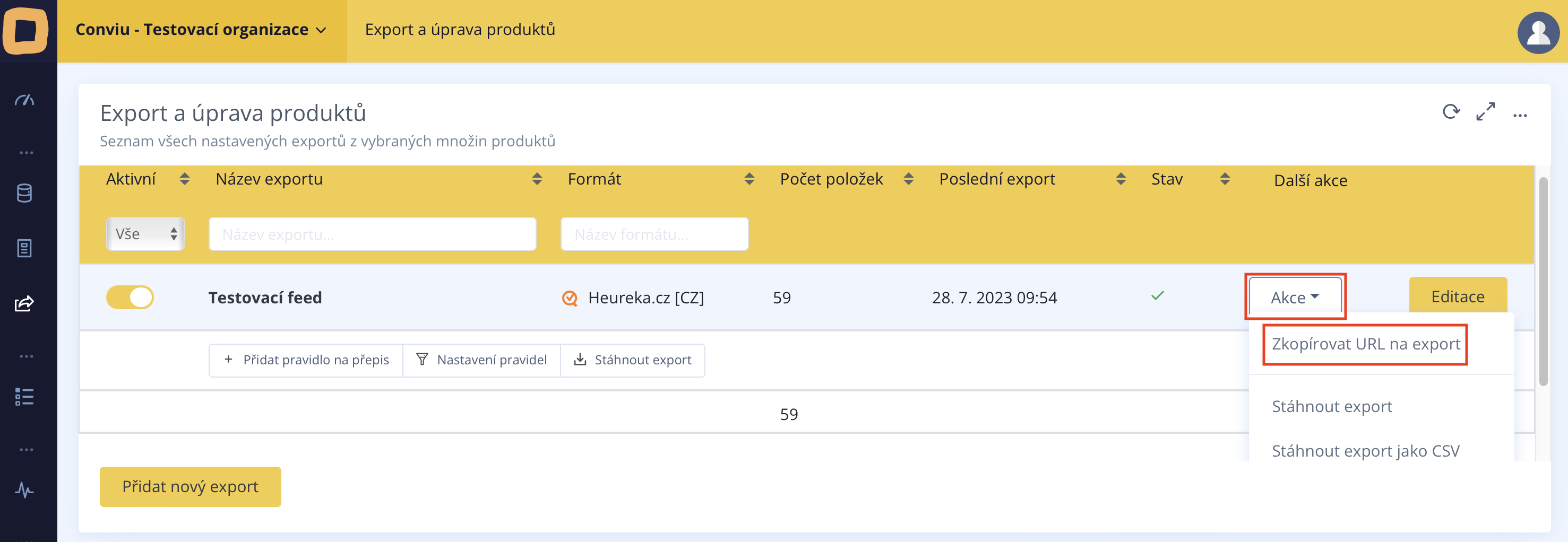 Gehen Sie im Abschnitt "Export a úprava produktů" zum gewünschten Export. Durch Klicken auf die Schaltfläche "**Aktion**" und die Auswahl "**URL für den Export kopieren**" erhalten Sie die URL-Adresse des neuen Exports.