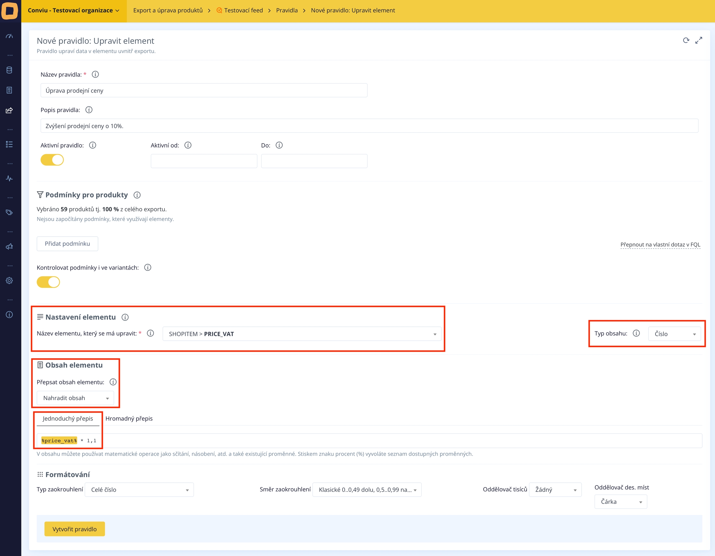 In den "Elementeinstellungen" wählen wir zuerst das Element aus, das den Verkaufspreis enthält. In unserem Fall handelt es sich um das Element SHOPITEM > PRICE_VAT. Dann wählen wir im "Elementinhalt" "Inhalt ersetzen" und "Einfache Überschreibung" aus. Vergessen Sie nicht, als Inhaltstyp "Nummer" anzugeben.