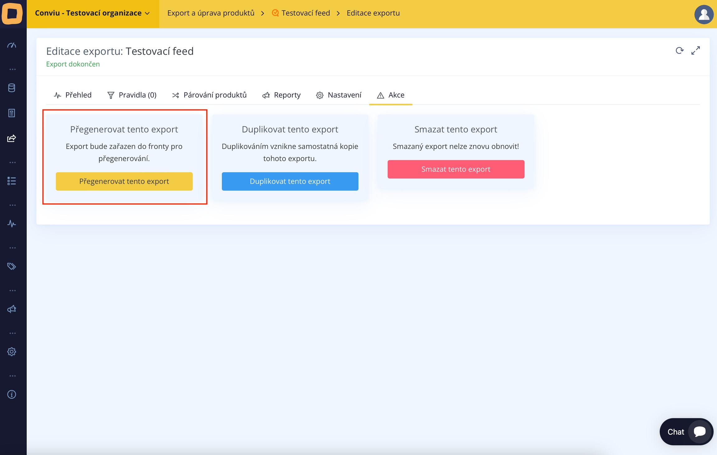 Wenn Sie möchten, dass die vorgenommene Änderung sofort wirksam wird, wechseln Sie im Export-Editor zur Registerkarte "Aktionen" und klicken Sie auf "Diesen Export neu generieren".