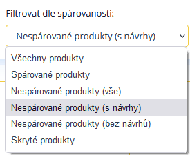 Es ist möglich, Produkte nach Preis, Kategorie, ID oder Namen zu sortieren. Im Filter wählen Sie Ungepaarte Produkte (mit Vorschlägen) aus. Jetzt sehen Sie eine Vorschau auf die unpaarigen Produkte und ihr Angebot auf Heureka, zu dem das Produkt gepaart werden kann. Wenn das Angebot übereinstimmt, bestätigen Sie die Auswahl durch Klicken auf die Schaltfläche Verknüpfen. Nach der Aktualisierung der Daten wird das Produkt auf Heureka gepaart. Ein Produkt kann jederzeit entpaart oder ein irrelevantes Angebot ausgeblendet werden.