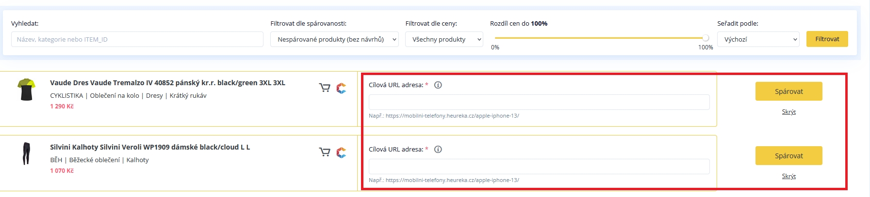 Falls bei einem unpaarten Produkt keine Vorschläge angezeigt werden, aber dennoch eine relevante Produktgruppe auf Heureka vorhanden ist, können Sie die entsprechende URL-Adresse von Heureka einfügen und Klicken Sie auf die Schaltfläche 'Verknüpfen'.