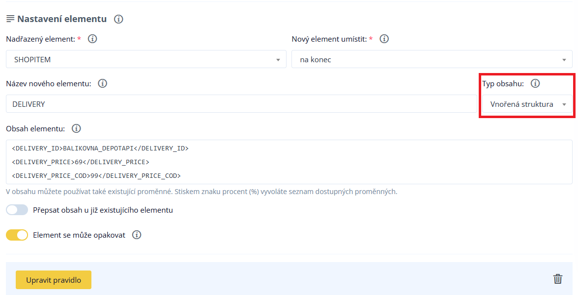 Im unteren Teil der Regeln setzen wir daher den Namen des neuen Elements: DELIVERY, und fügen DELIVERY_ID mit dem Wert BALIKOVNA_DEPOTAPI hinzu. Darüber hinaus ist es erforderlich, ein verschachteltes Element mit dem Wert für die Versandkosten DELIVERY_PRICE und den Versandkosten einschließlich Nachnahme einzufügen - DELIVERY_PRICE_COD. Es ist wichtig, im Abschnitt "Inhaltstyp" die Option "Verschachtelte Struktur" auszuwählen.