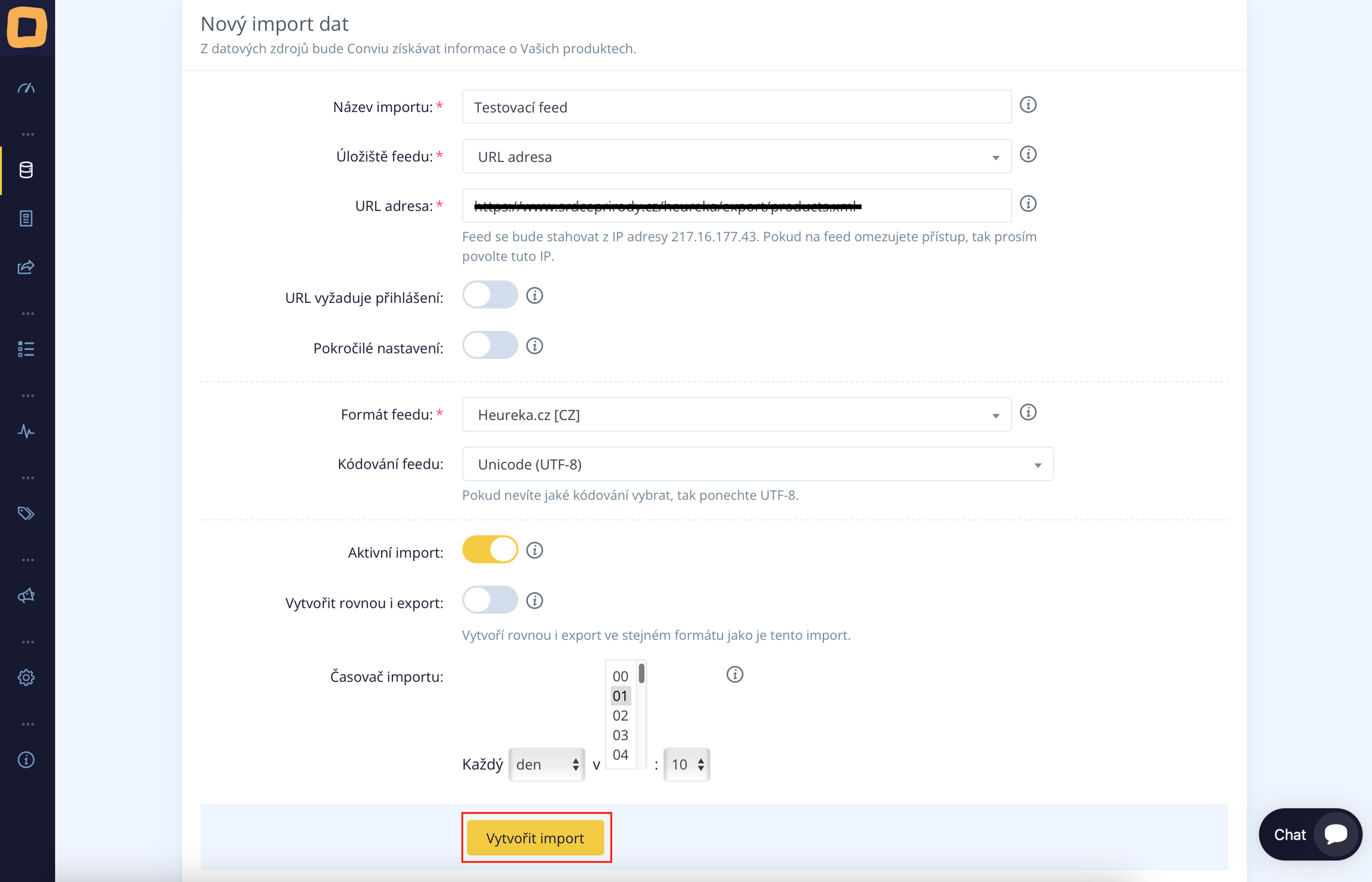 Der nächste Schritt ist die Eingabe des Datenimports selbst. Hier müssen Sie alle erforderlichen Informationen von der Bezeichnung bis zur Zeitplanung des Datenimports ausfüllen. Im untenstehenden Bild sehen Sie ein Beispiel für die Eingabe eines fertigen XML-Feeds im Heureka-Format.