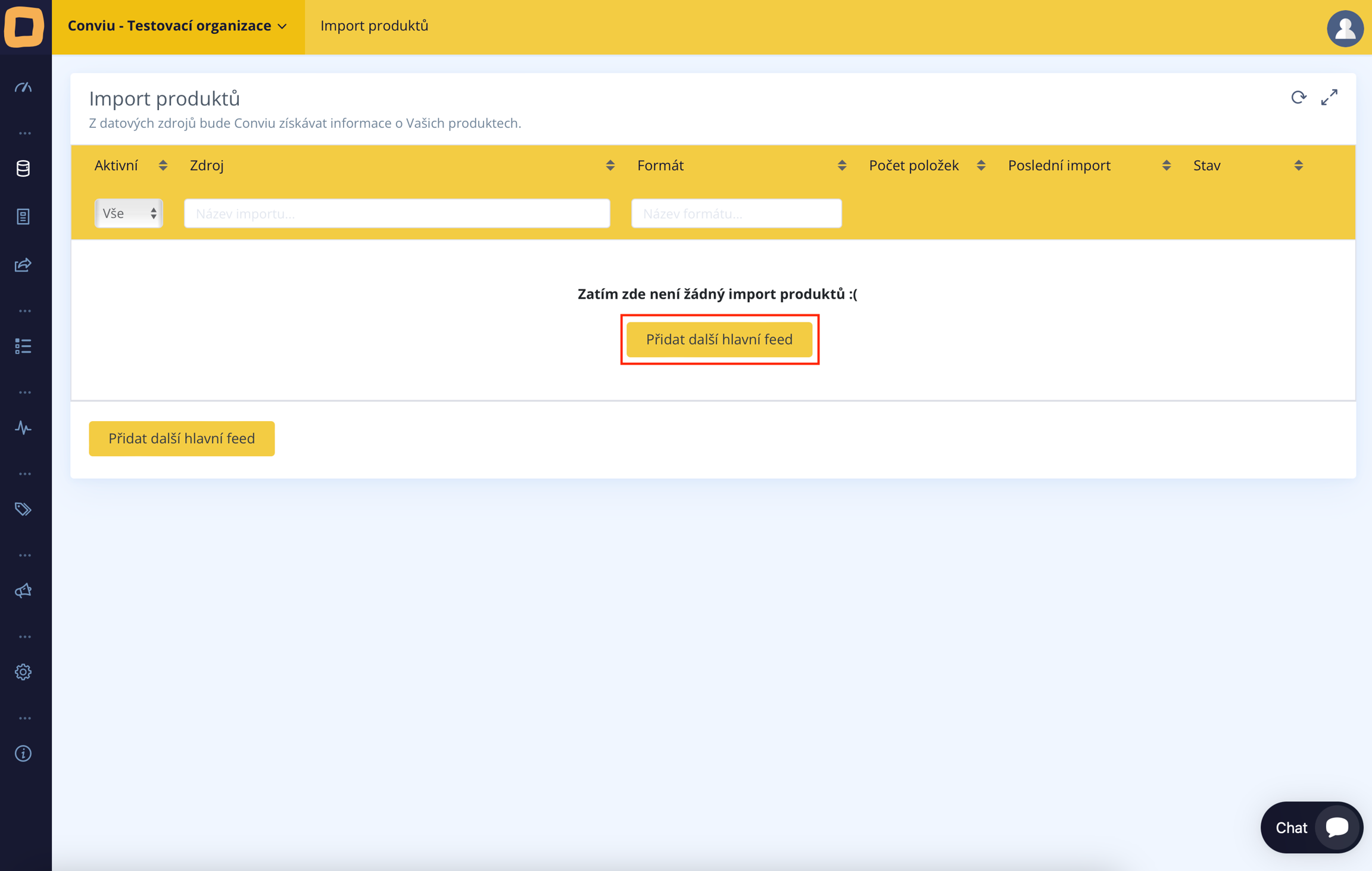 Sie gelangen zu einer Übersicht aller Importe, die Ihre Organisation enthält. Da Sie jedoch den ersten Datenimport einrichten, klicken Sie einfach auf "Weiteren Haupt-Feed hinzufügen"