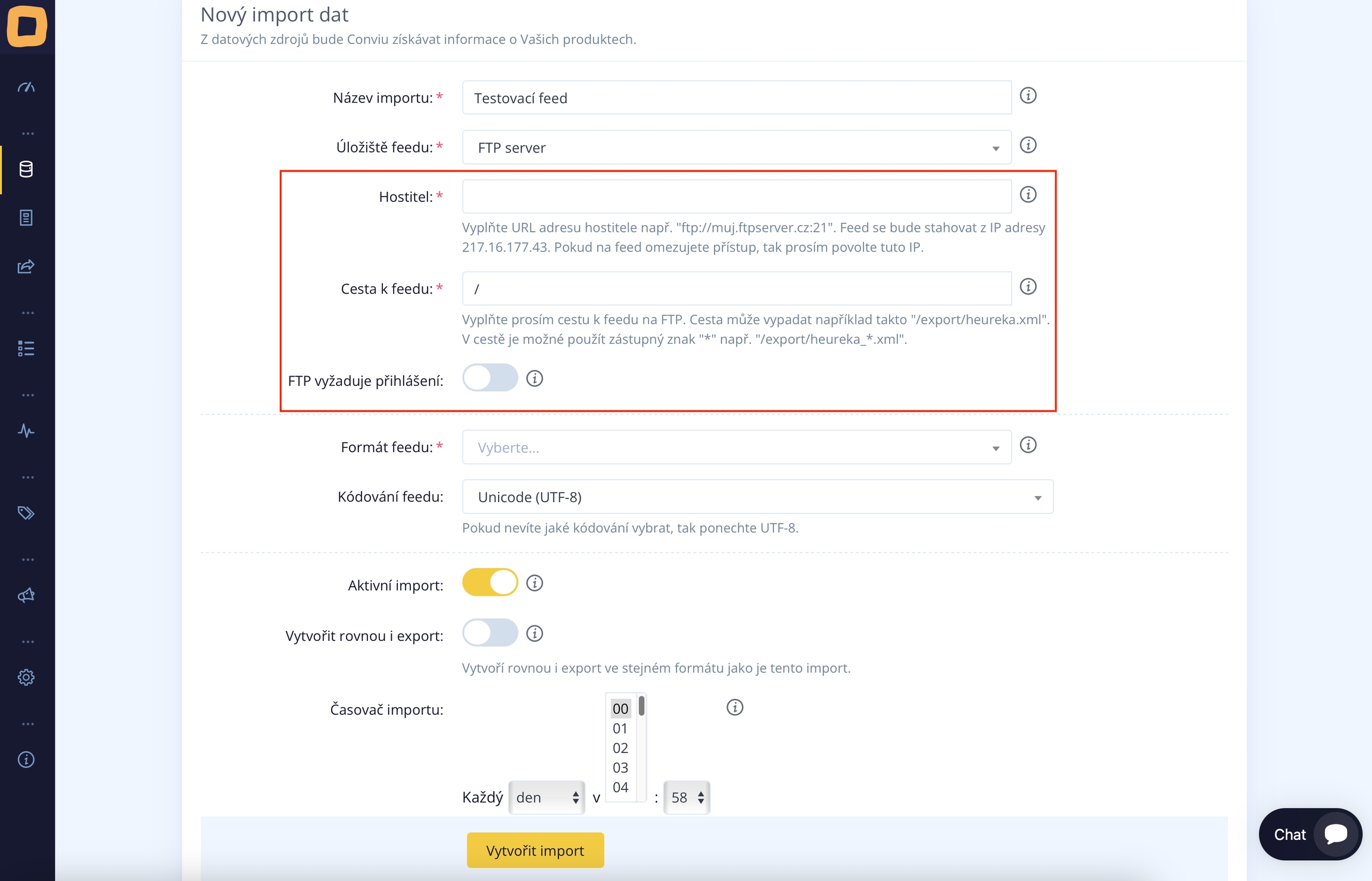 Feed-Pfad: Melden Sie sich beim FTP an (über einen beliebigen FTP-Client auf Ihrem Computer) und suchen Sie die Datei, die Sie in Conviu importieren möchten. Füllen Sie dann den Pfad zu dieser Datei in Conviu aus.
