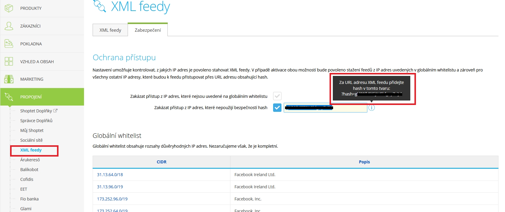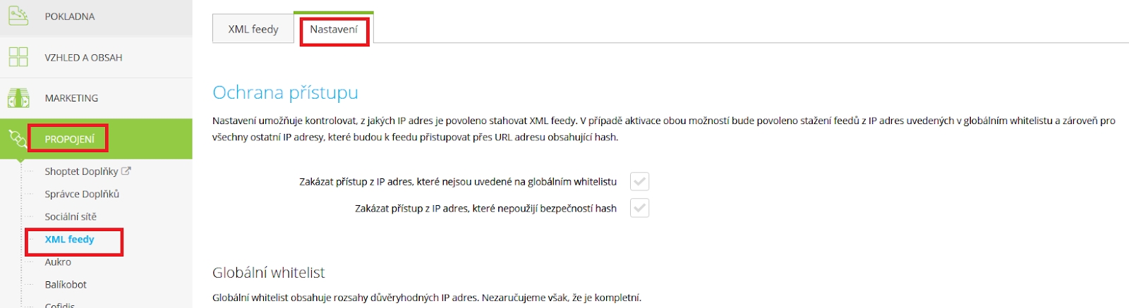 Im Falle der Verwendung des Shoptet E-Commerce-Systems empfehlen wir zu überprüfen, ob die IP-Adresse in den Einstellungen unter "Verbindung -> XML-Feeds" auf der Whitelist steht.