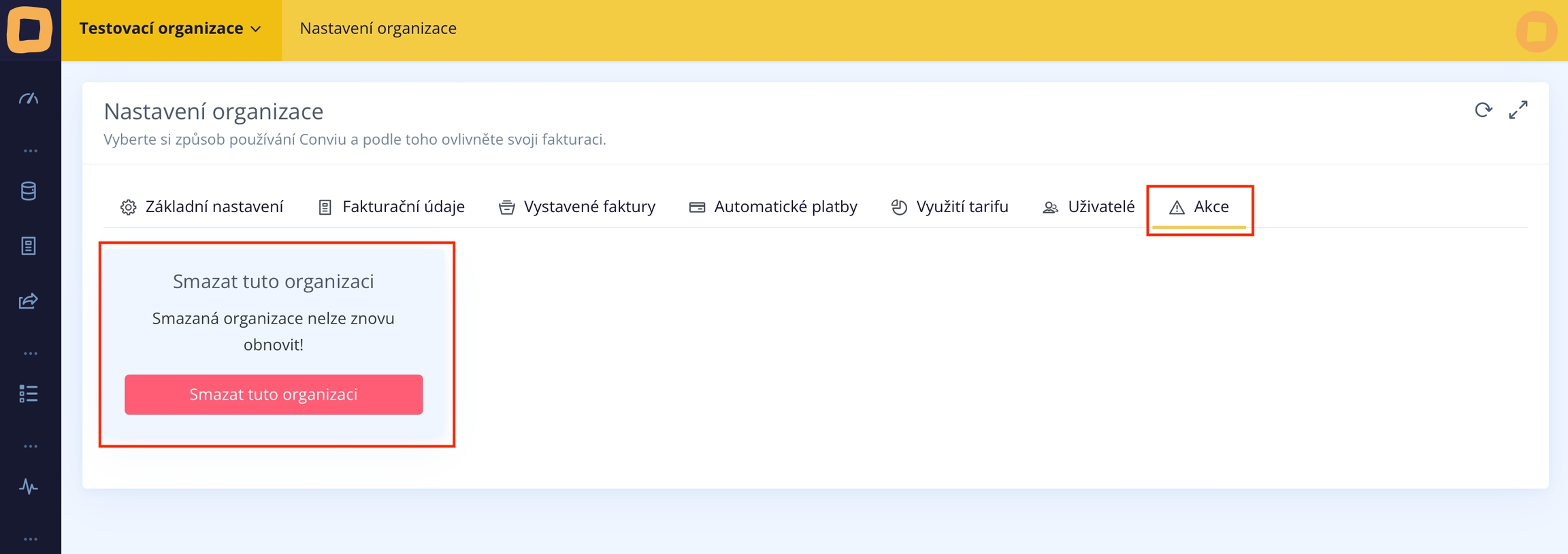 Gehen Sie zum Tab "Aktionen" und klicken Sie auf "Diese Organisation löschen"