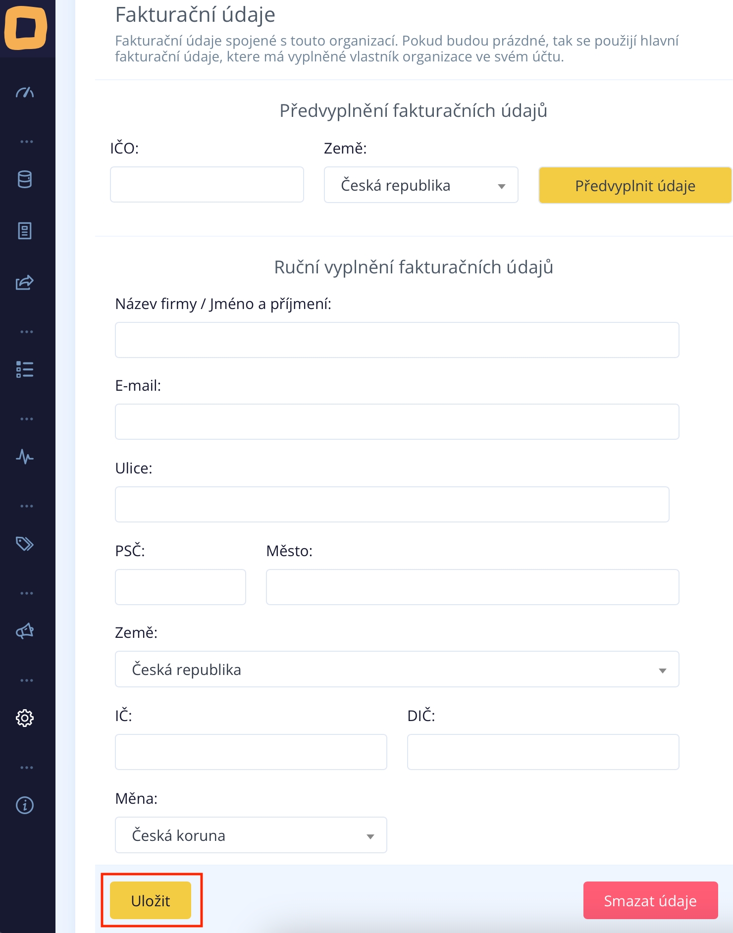 Sie füllen den Firmennamen oder Ihren Vor- und Nachnamen, Ihre E-Mail-Adresse, Adresse sowie Ihre USt-IdNr. (DIČ) und Unternehmensidentifikationsnummer (IČO) aus.