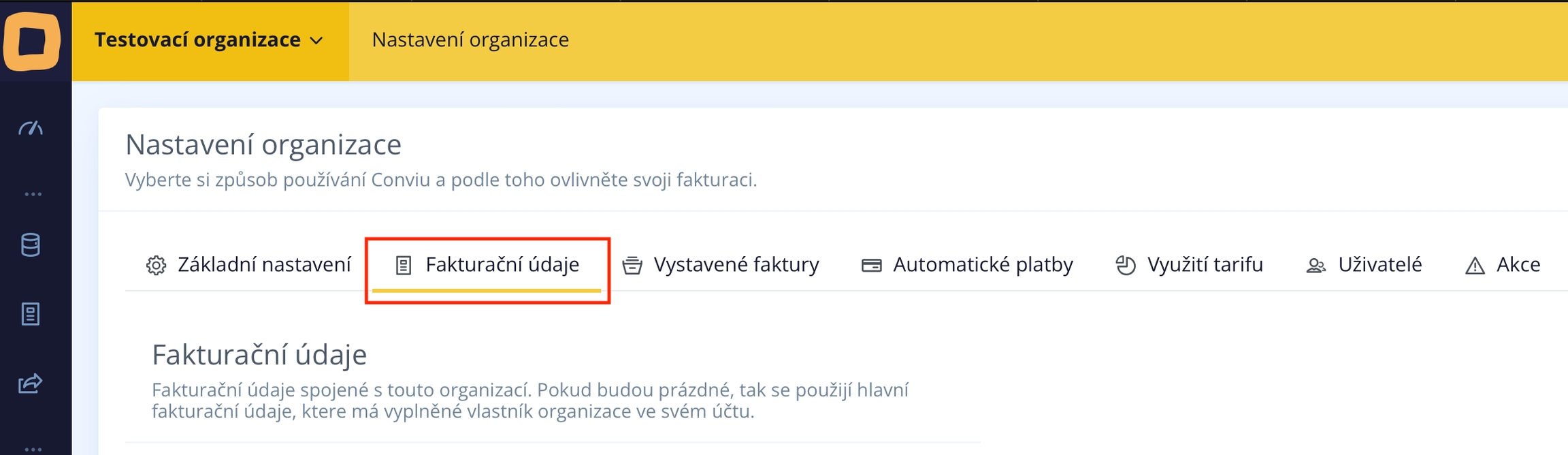 Nach dem Klicken wird Ihnen die Einstellungsseite Ihrer Organisation angezeigt. Wählen Sie dann die Registerkarte "Rechnungsinformationen" aus.