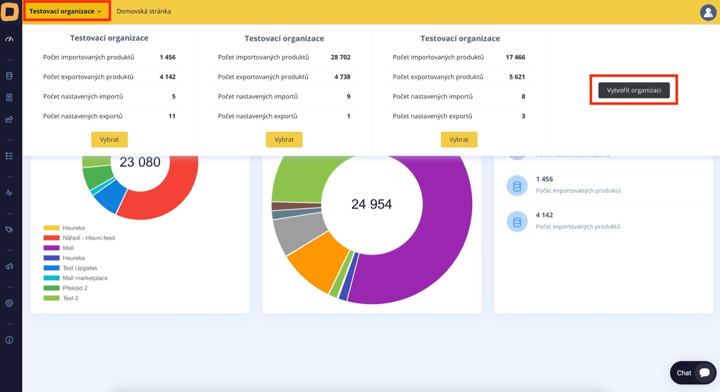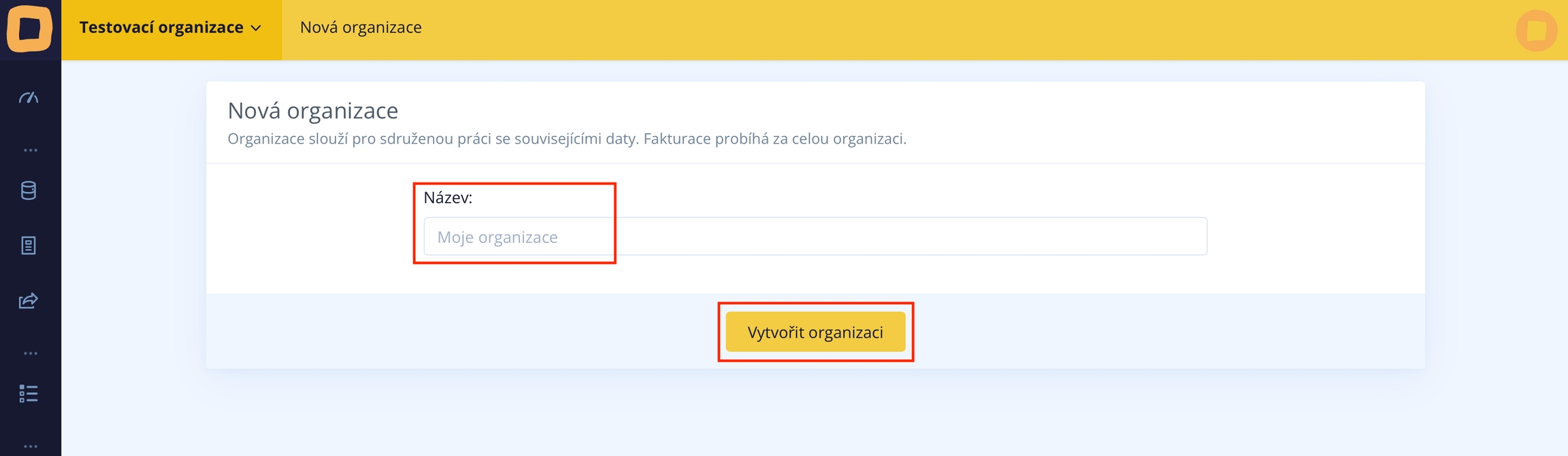 Auf der Startseite Ihres Kontos klicken Sie in der linken oberen Ecke auf ihren Namen. In unserem Fall handelt es sich um "Testovací organizace". Es werden Ihnen alle Ihre vorhandenen Organisationen und auch das Symbol "Organisation erstellen" angezeigt.
